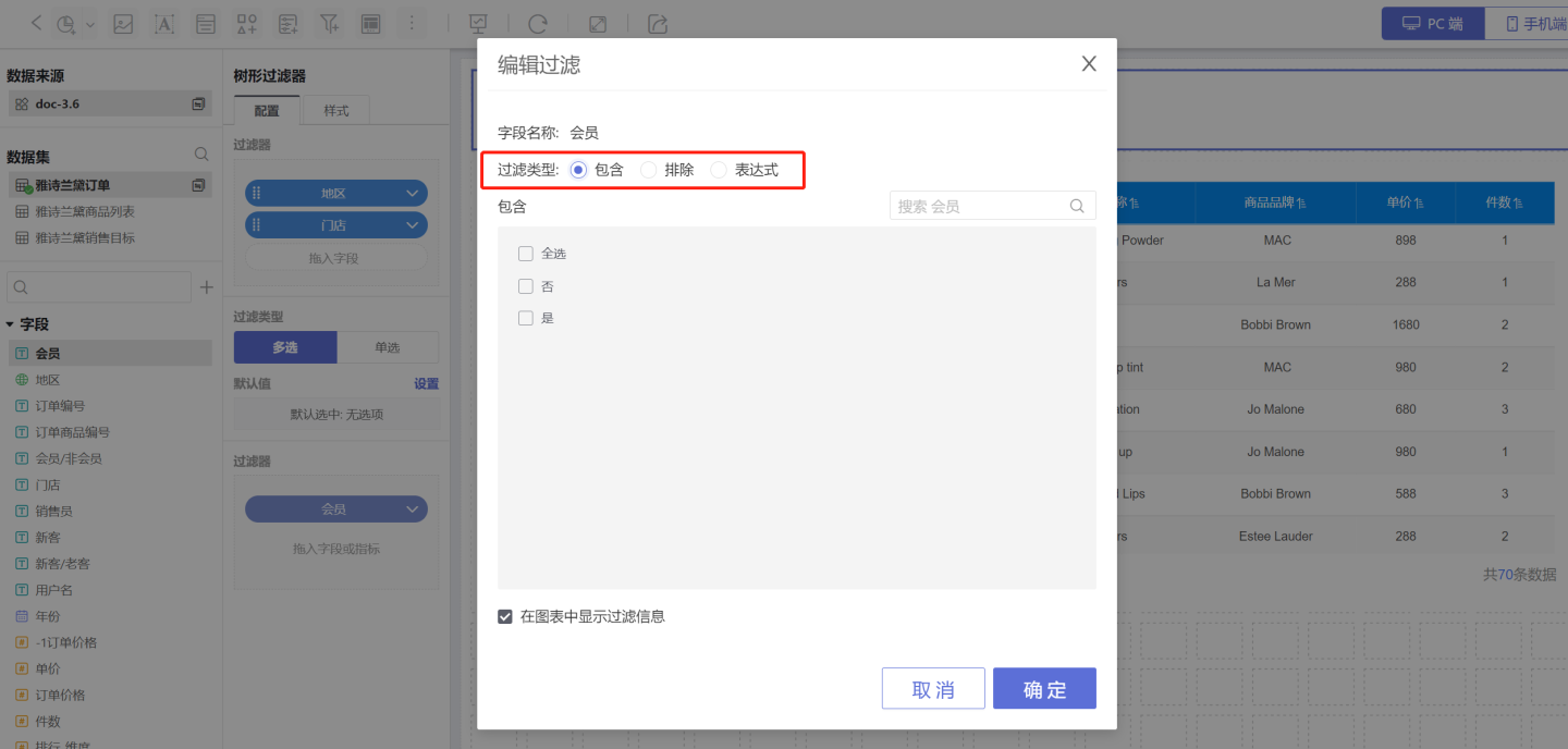 内部过滤器可以设置是否在图表中展示过滤信息,当勾选该项后,打开图表的时候会显示该信息。