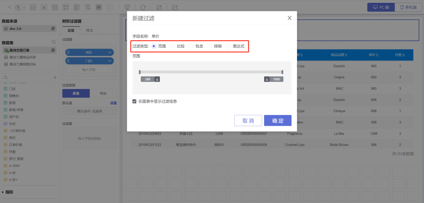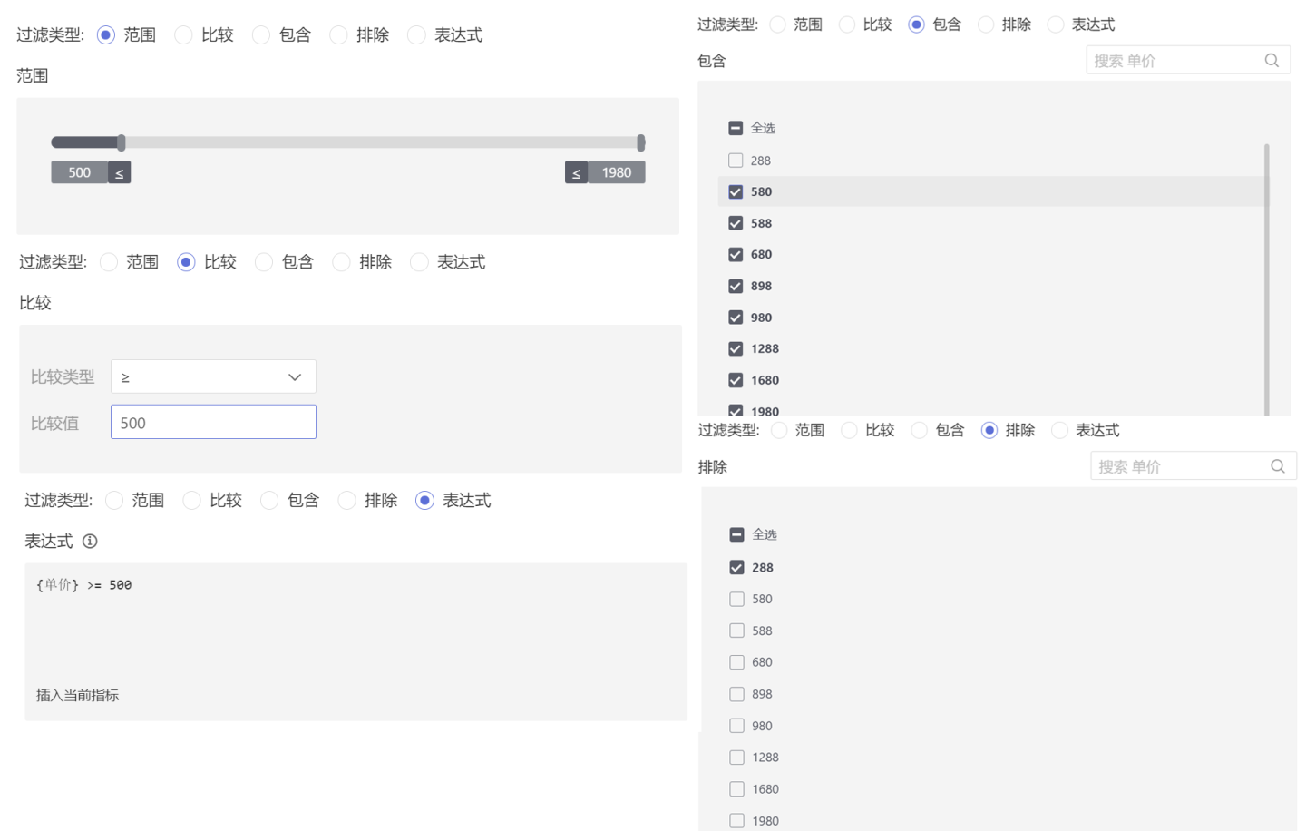 如示例中,选择单价大于500以上的销售订单的门店时,使用不同方法进行过滤操作: