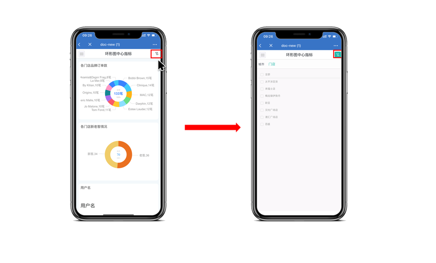 - 子级过滤器的默认值选择受父级过滤器的影响。如城市的默认值选择北京,门店的默认值选择来福士店,而北京没有来福士店,所以此时默认值会自动选择北京下面的第一个门店。