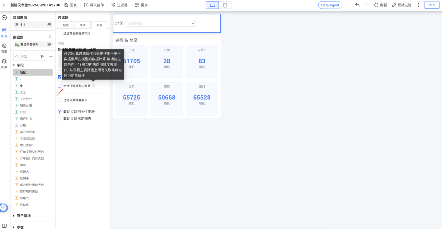 联动过滤相关性图表,其中相关性图表指的是使用过滤选项所在数据集制作的图表。该项默认选中,表示过滤器选项变化时会联动本仪表盘中所有相关性图表。
