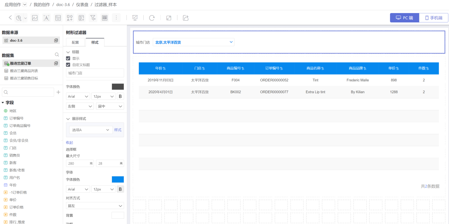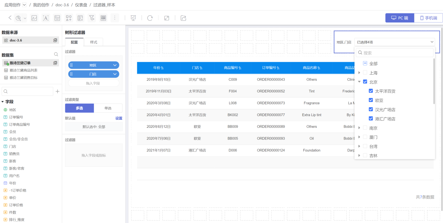 树形过滤器,以树形结构展示过滤字段,可以对多个有层级关系的字段如“国家-省份-城市”、“年-月-日”、“公司-部门”等实现过滤。 示例中查看城市中门店的订单记录,城市和门店两个过滤信息可以通过一个树形过滤器来筛选。