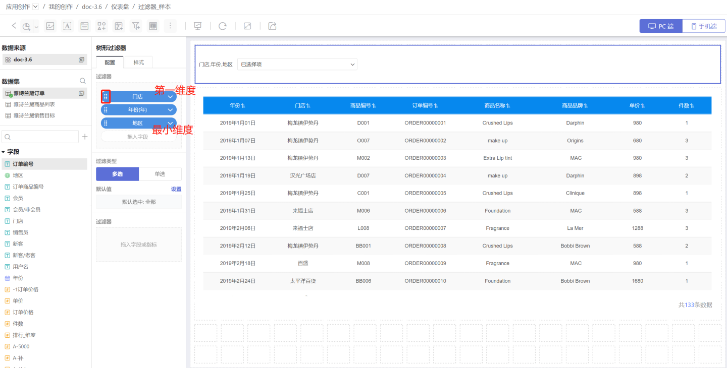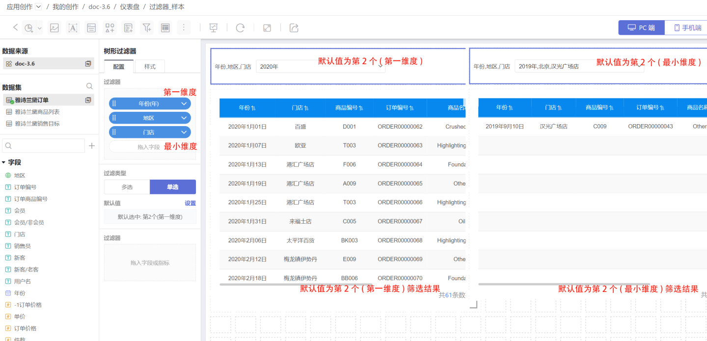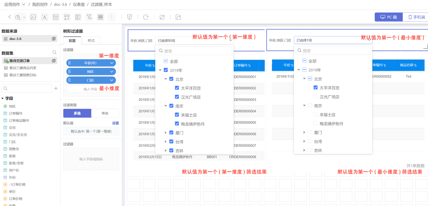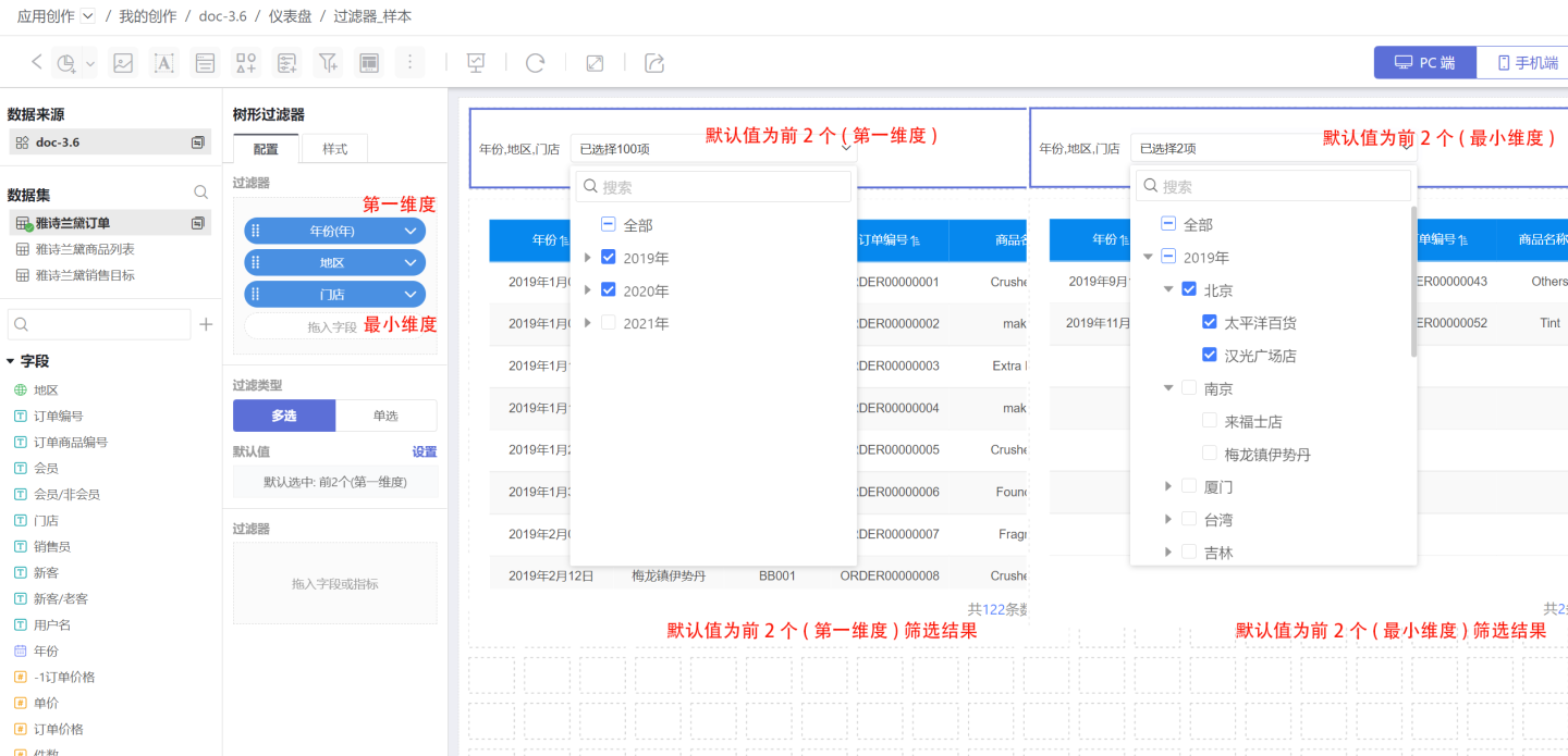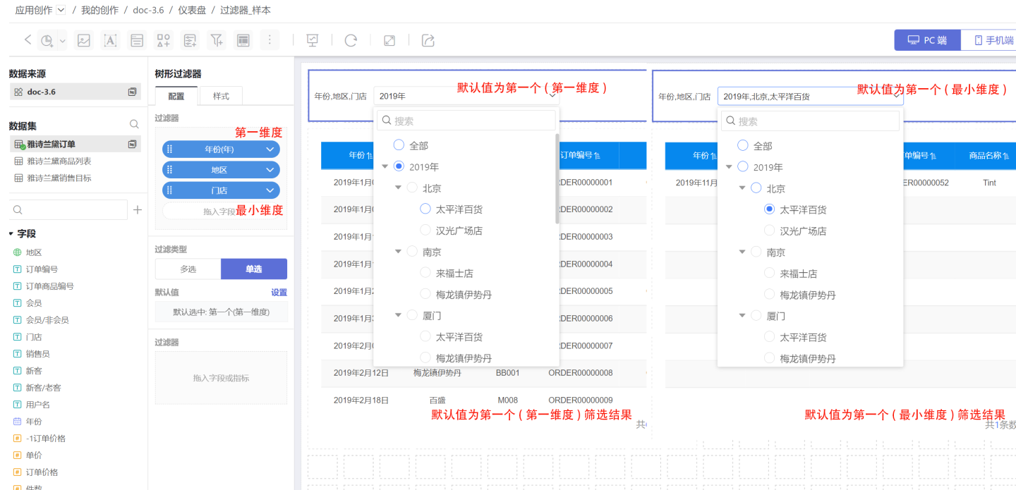 第一维度时,默认值为第一维度的第一个,并通过该选项筛选数据。当选择最小维度时,默认值为最小维度的第一个,并通过该选项筛选数据。 示例中第一维度是年份、最小维度是门店,选项第一个(第一维度)选中的是2019年及下面的所有子项,选项第一个(最小维度)是太平洋百货,过滤时需要带上它的父级,所以筛选的是2019年、北京、太平洋百货的订单信息。