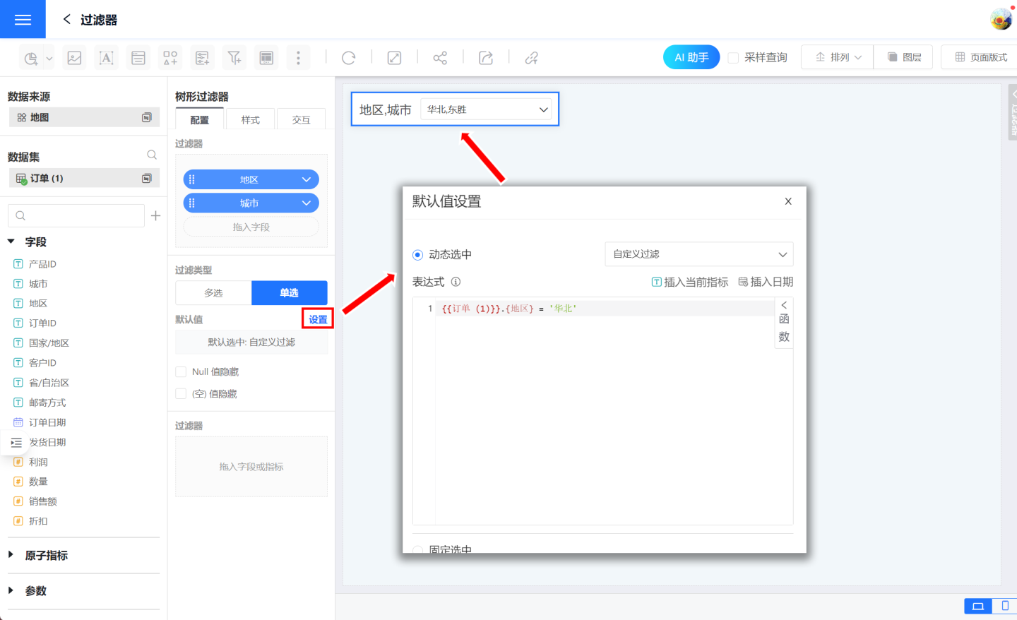 第一维度时,默认值为第一维度的第 N 个,并通过该选项筛选数据。当选择最小维度时,默认值为最小维度的第 N 个,并通过该选项筛选数据。示例中第一维度是年份、最小维度是门店。选项第2个(第一维度)是2020年,筛选2020年所有订单信息。选项第2个(最小维度)是汉光广场店,过滤时需要带上它的父级,所以筛选的是2019年、北京、汉光广场店的订单信息。