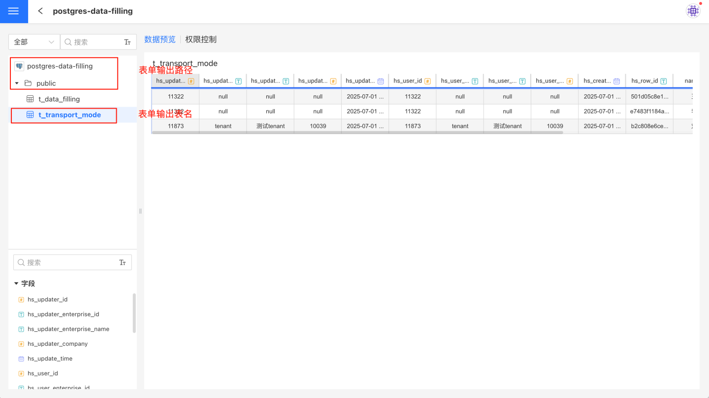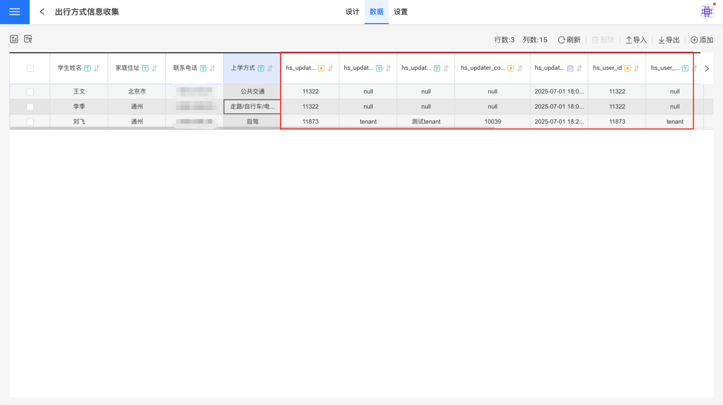 数据中除了收集的字段信息,还包含 hs_user_id、hs_updater_id、hs_user_company、hs_updater_company、hs_user_enterprise_id、hs_updater_enterprise_id、 hs_user_enterprise_name、hs_updater_enterprise_name、hs_create_time、hs_updater_time、hs_row_id 十一个系统添加的字段: