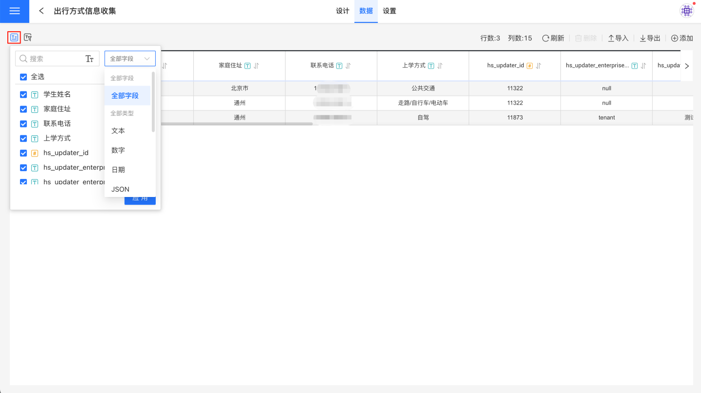 数据左上角第一个按钮控制字段展示,可以勾选需要展示的字段,也可以通过字段类型筛选字段。