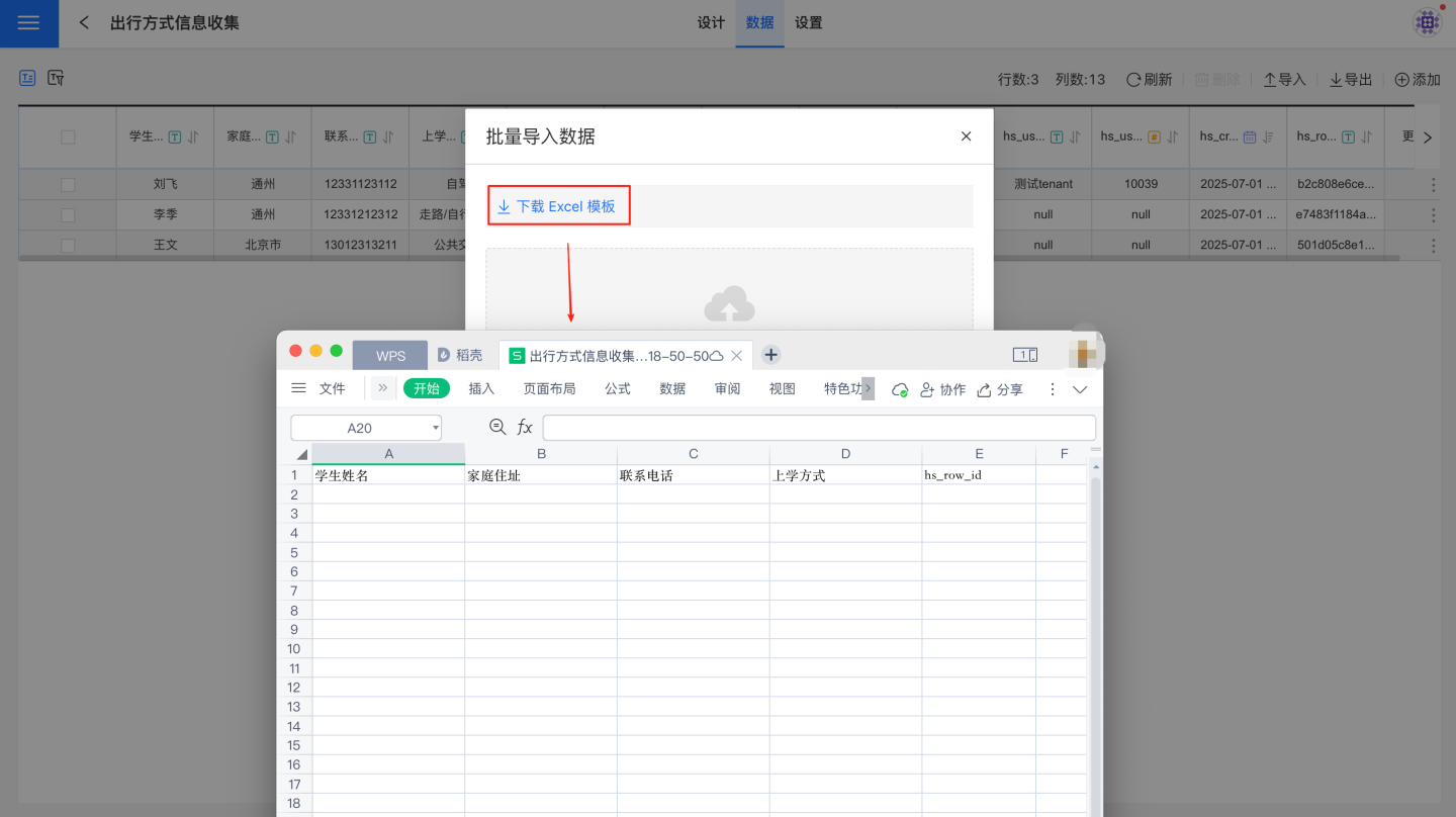 导入: 使用文件批量导入填报数据。导入时,请先下载模板,使用模板填写数据。如果批量导入过程中需要修改已经提交的数据,请在模板中填写完整的修改内容,同时填写修改记录的 hs_row_id,系统会通过 hs_row_id 进行匹配,修改数据。 hs_row_id 为空时系统默认是新增记录。