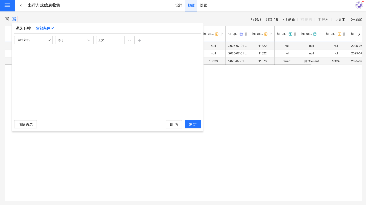 表单数据页面提供了数据筛选和字段展示功能,方便查看表单数据。