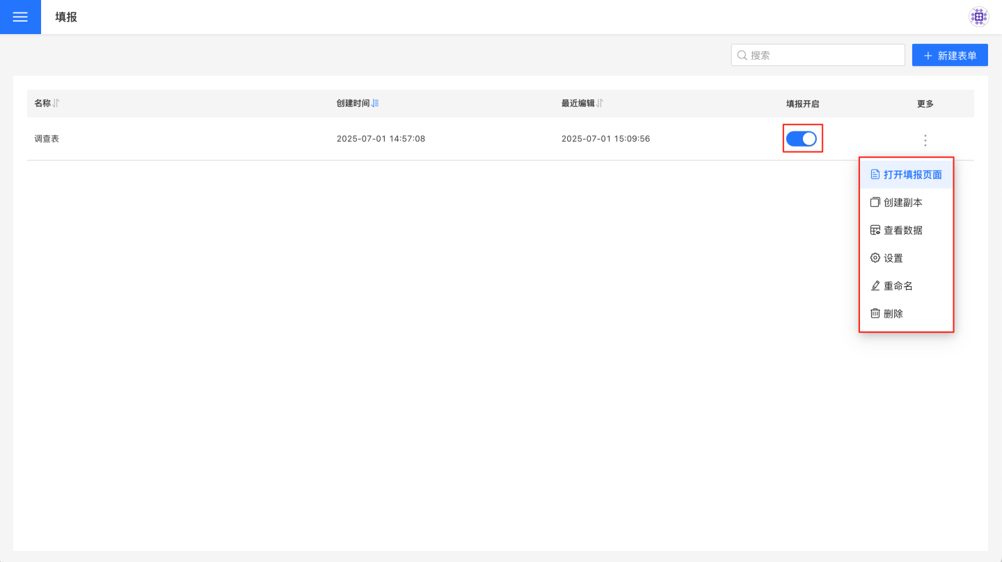 进入数据填报模块,可以查看所有表单,支持表单搜索、表单排序,包括名称排序和时间排序。