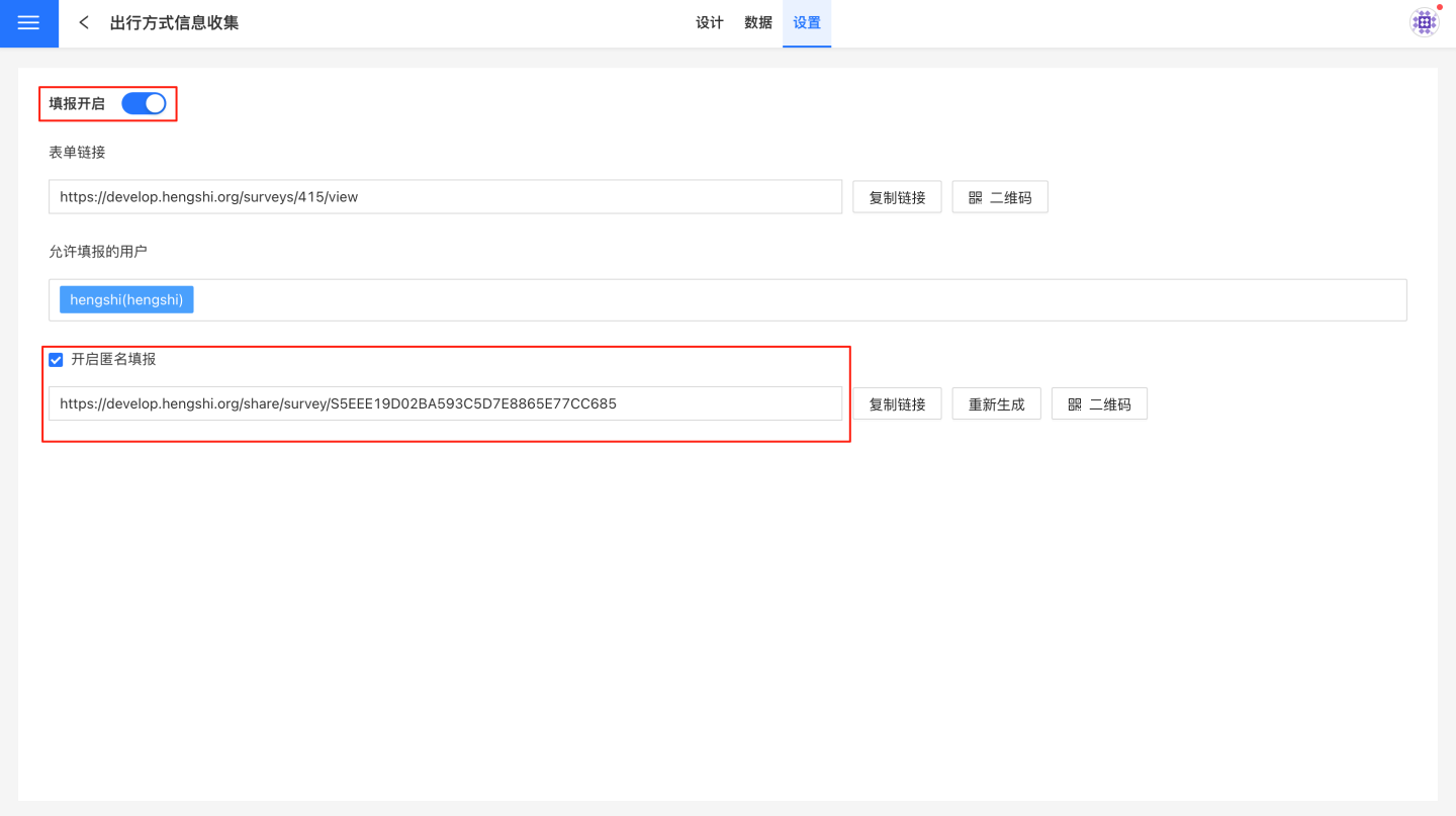 开启填报后,默认打开了实名填报。 支持使用链接或二维码将表单分享给系统内用户进行填报。