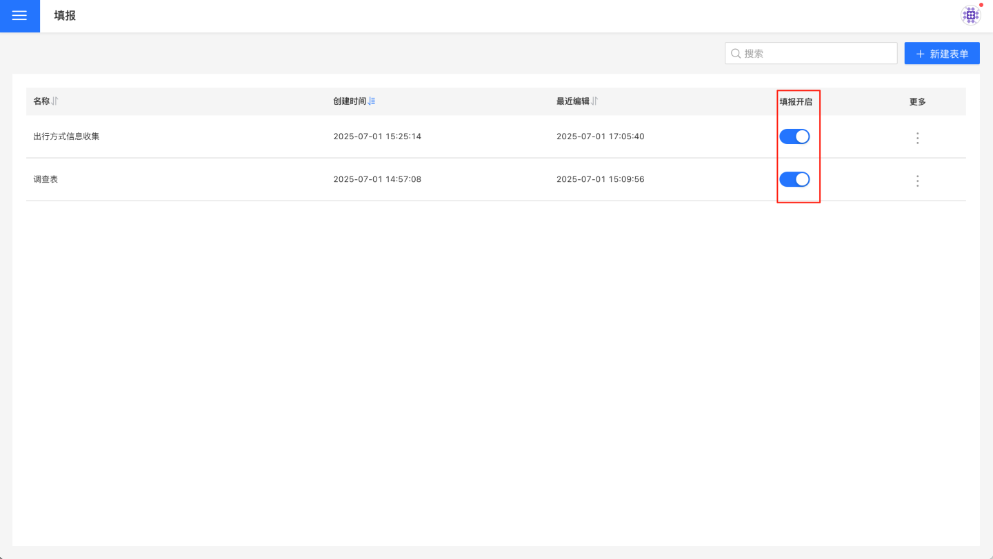 表单创建后需要开启填报才能进行表单填写、收集数据。表单填写过程中可以随时暂停填报。