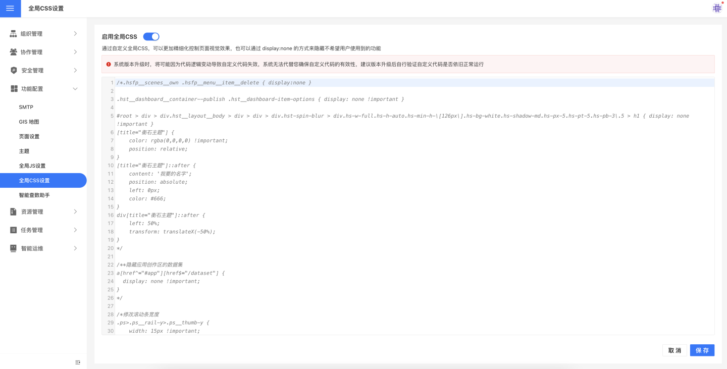 衡石系统提供了全局 CSS 功能。通过自定义全局 CSS 可以更加精细化控制页面视觉效果,例如可以通过 display:none CSS 规则来隐藏不需要展示的功能。
