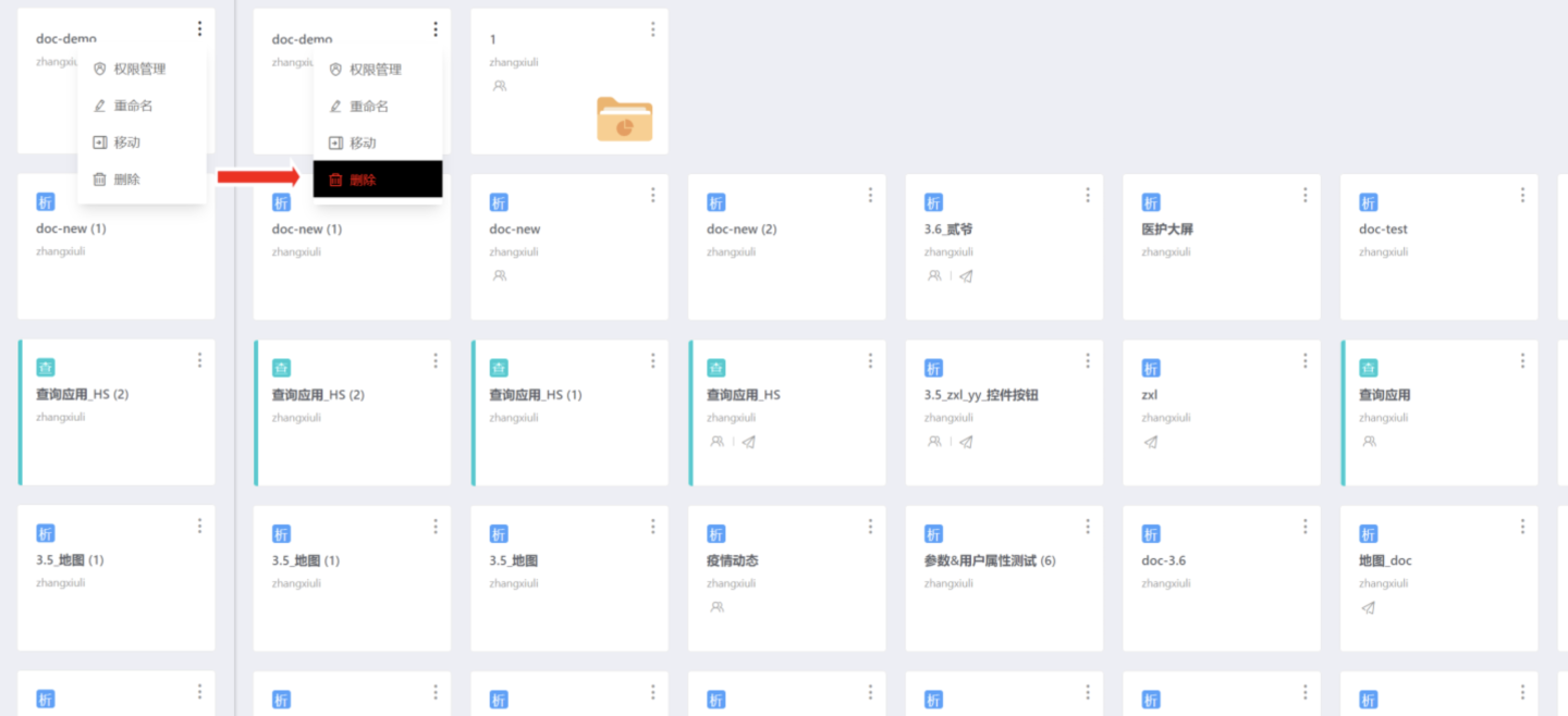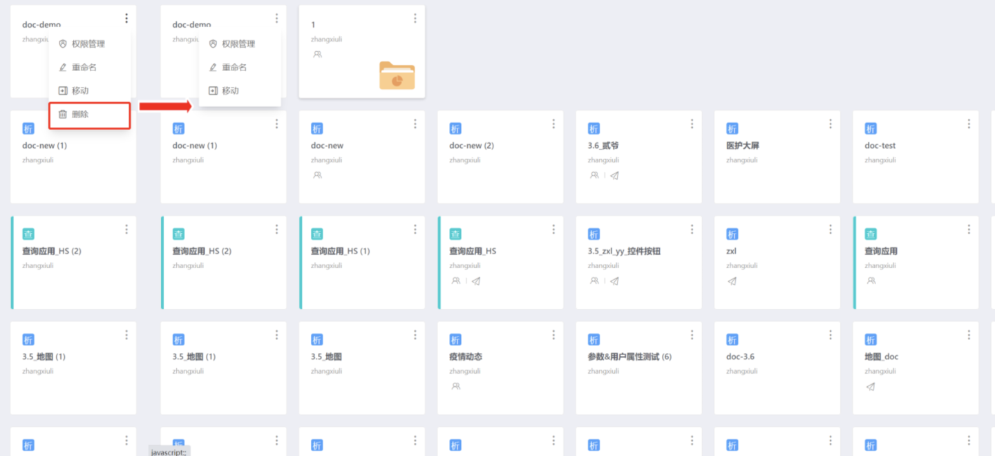 也可以通过 CSS 设置隐藏功能按钮。示例中隐藏应用创作菜单中的删除按钮,不会对其他模块的删除按钮进行隐藏。