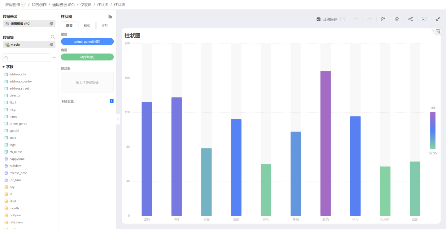 柱状图,是针对离散型数据所做的统计图表。每根柱子代表一个类别(维度),柱子的长度是该类别下的统计数值(度量)。柱状图提供方便的排序功能,方便看到最大值和最小值。 典型的柱状图如下所示: