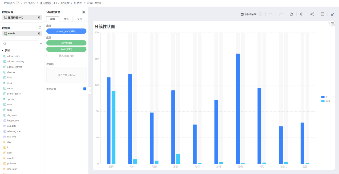 分簇柱状图允许在 Y 轴选择多个度量,从而形成对比关系。如下图所示: