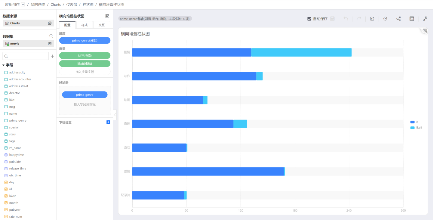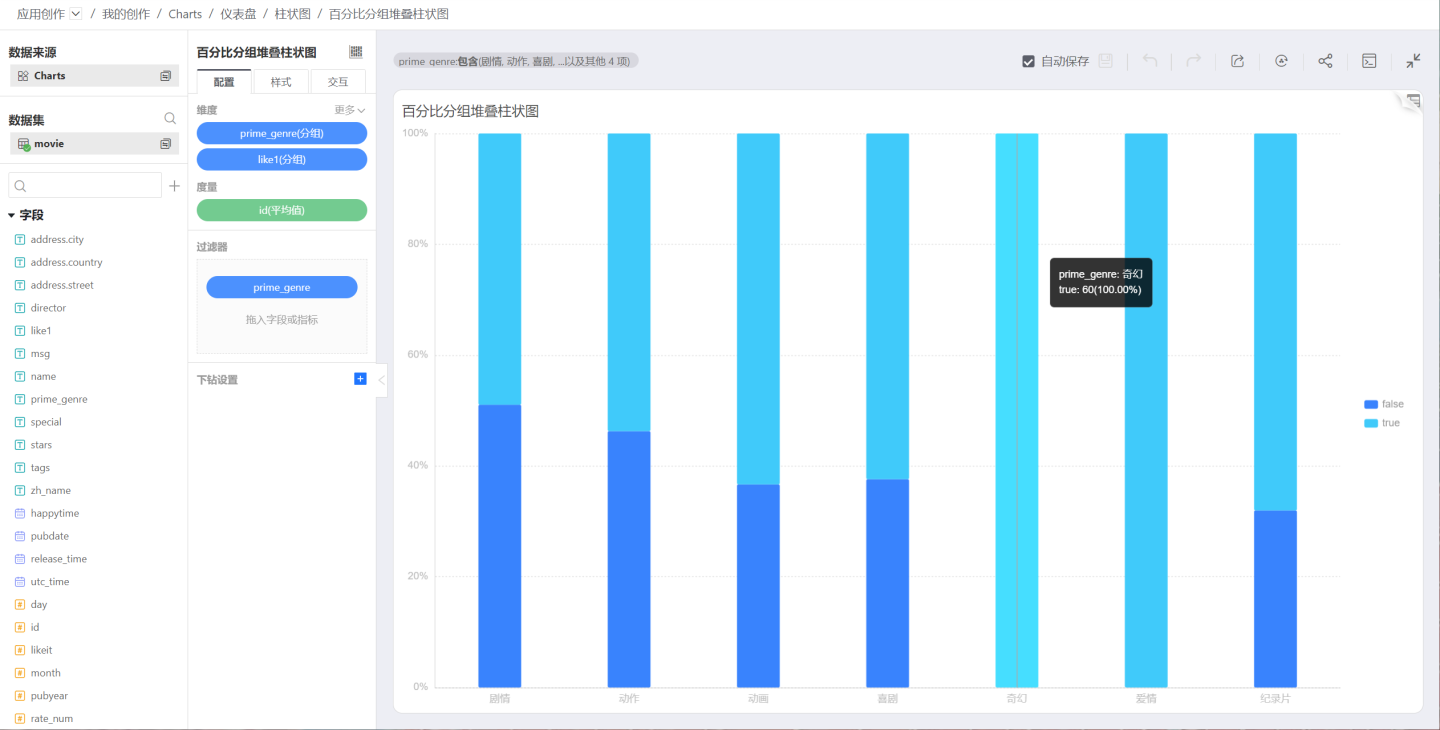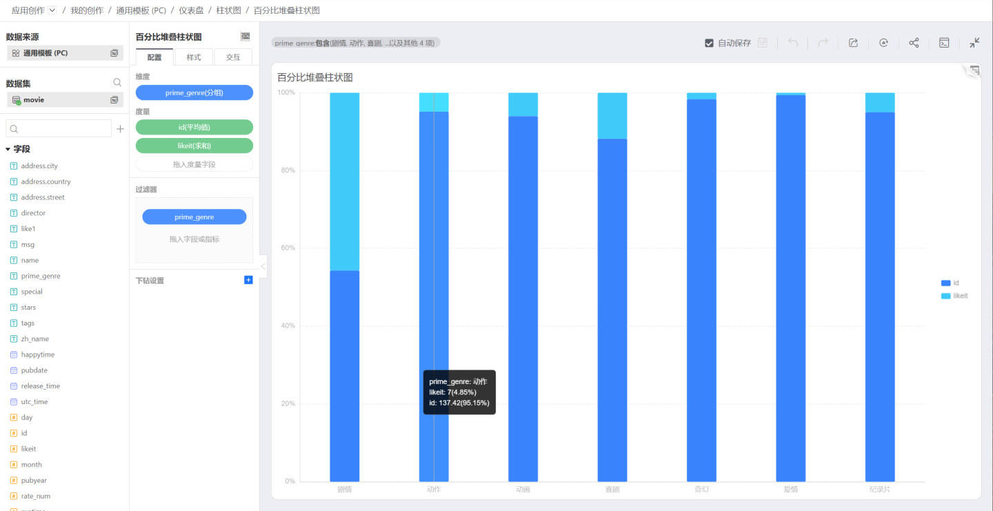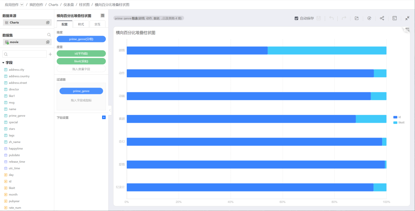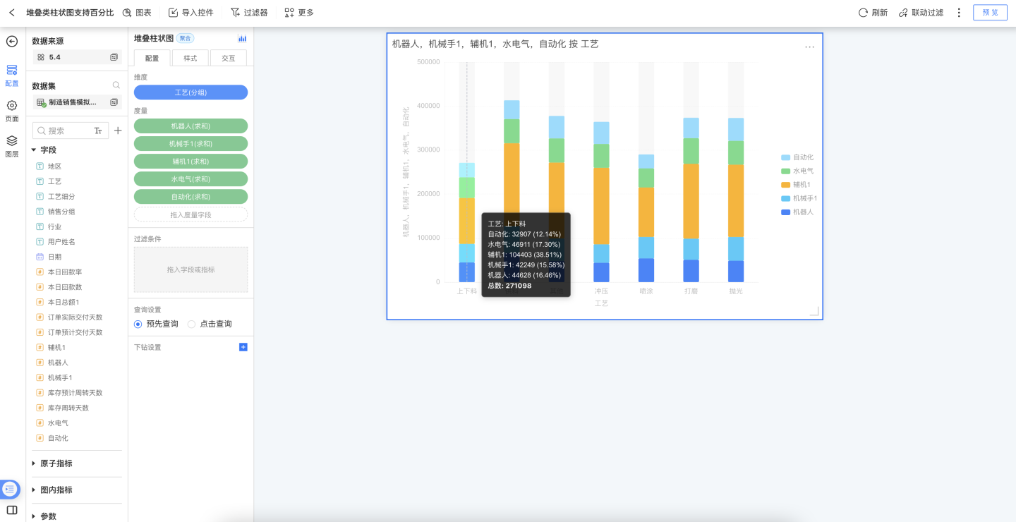 可以选择多个度量,横向堆叠显示每个维度下每个分量的占比情况。