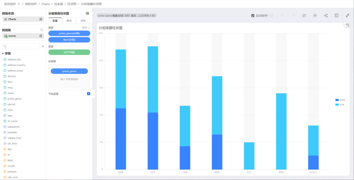 分组堆叠柱状图与并排显示分类的分组柱状图不同,分组堆叠柱状图将每个柱子进行分割以显示相同类型下各个数据的大小情况。 分组堆叠柱状图可以形象地展示一个大分类包含的每个小分类的数据,以及各个小分类的占比,显示的是单个项目与整体之间的关系。