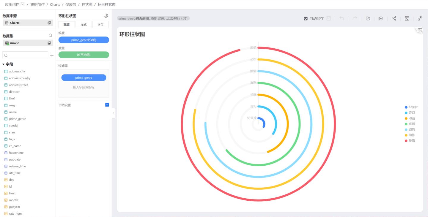 环形柱状图区别于柱状图的地方,就是将显示样式变成了圆环的模式。如下图所示: