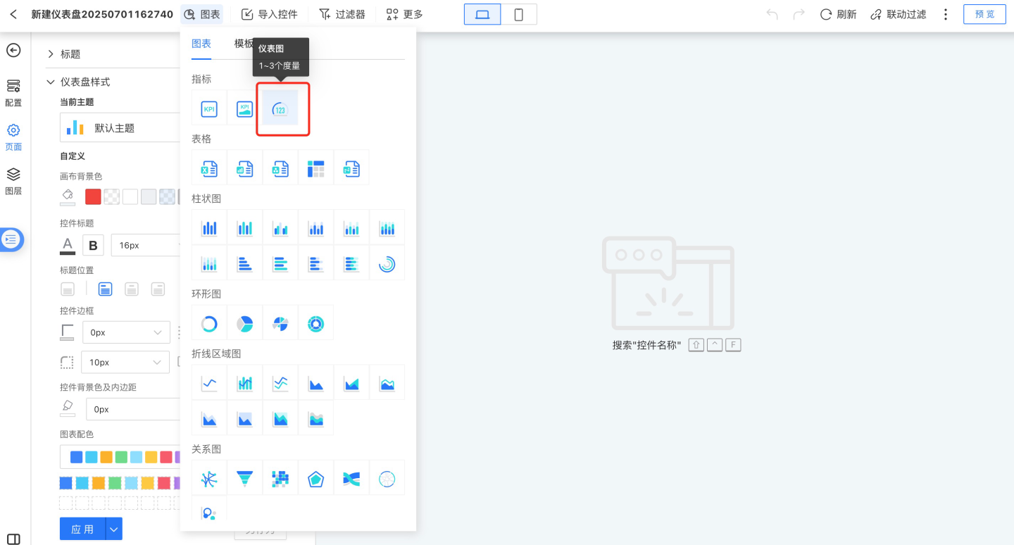 新建仪表图。点击添加图表控件按钮,选择仪表图并配置仪表图使用的数据集。
