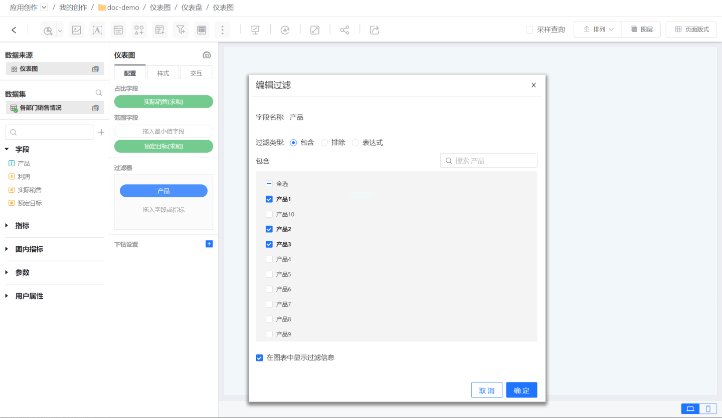 添加图内过滤器,对仪表图的数据进行过滤。如图所示使用过滤器仅展示3个产品的相关数据。