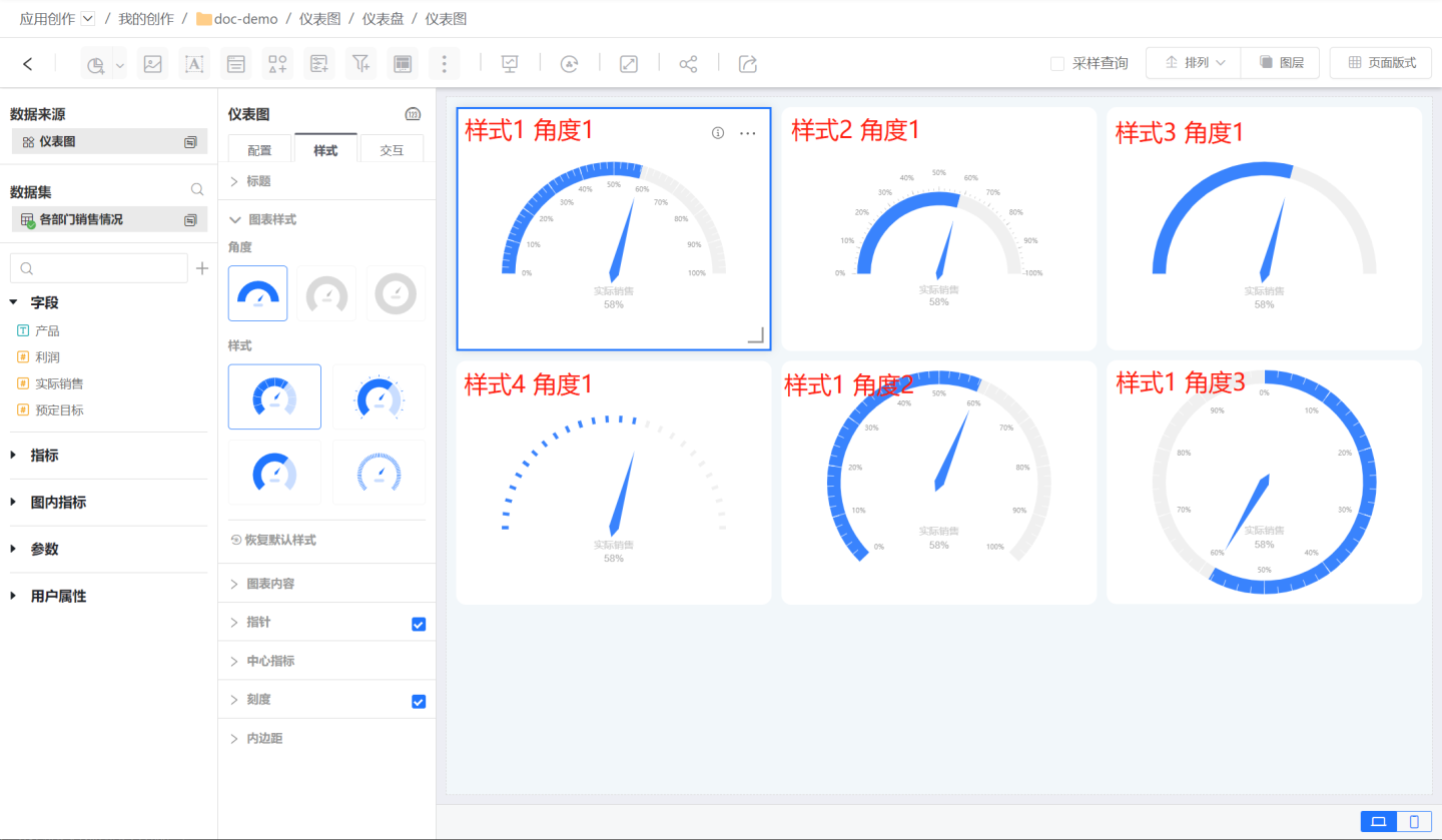 仪表图支持四种样式,每种样式有三种角度可以设置,默认支持12种仪表图样式。