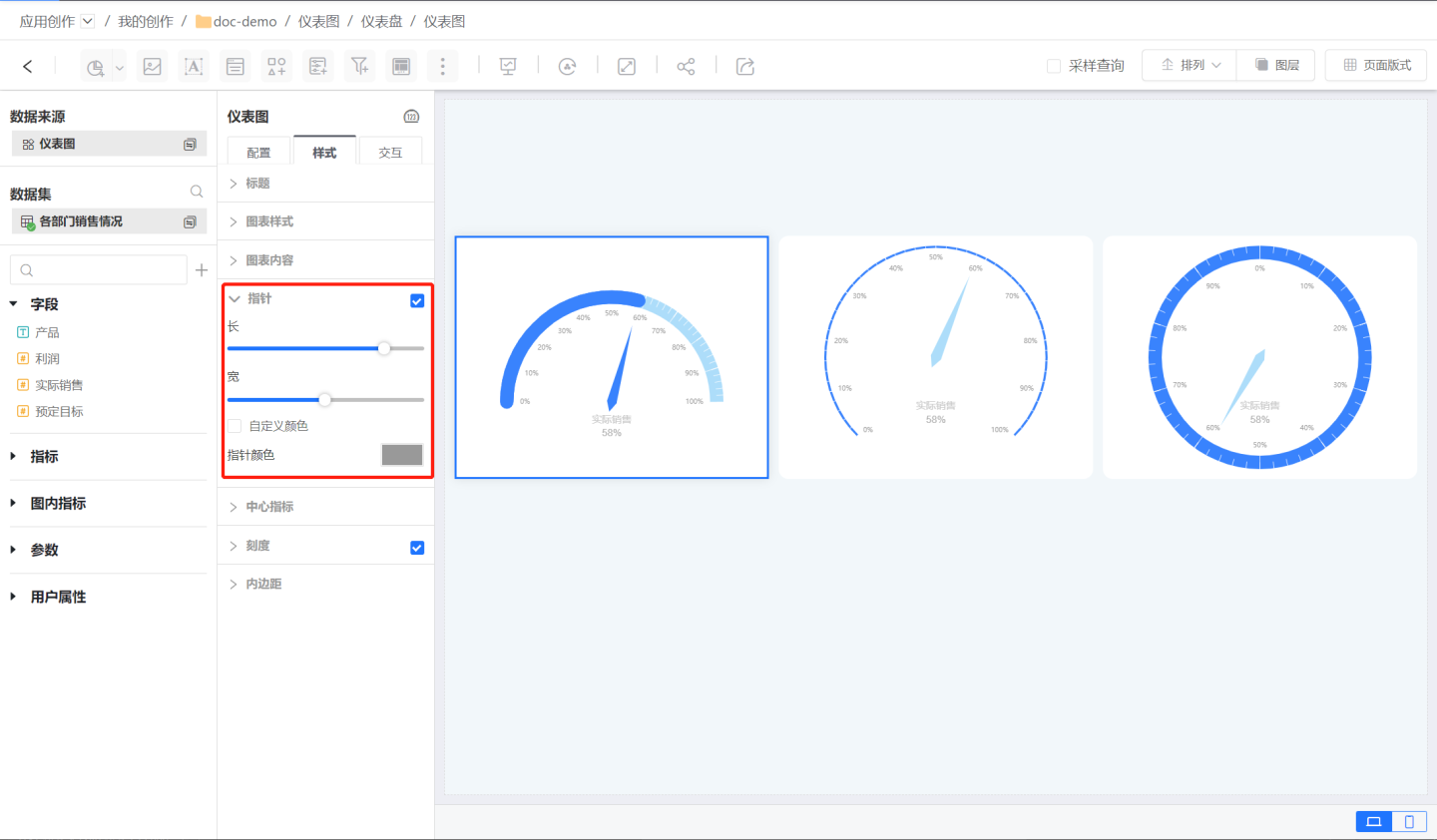 仪表图的指针可以设置长、宽和颜色。 示例中左侧图表使用默认指针模式,中间和右侧的图表使用了自定义指针。 仪图表也可以不显示指针。