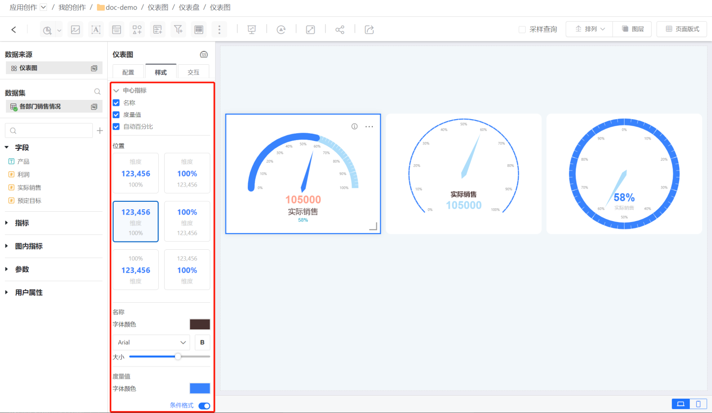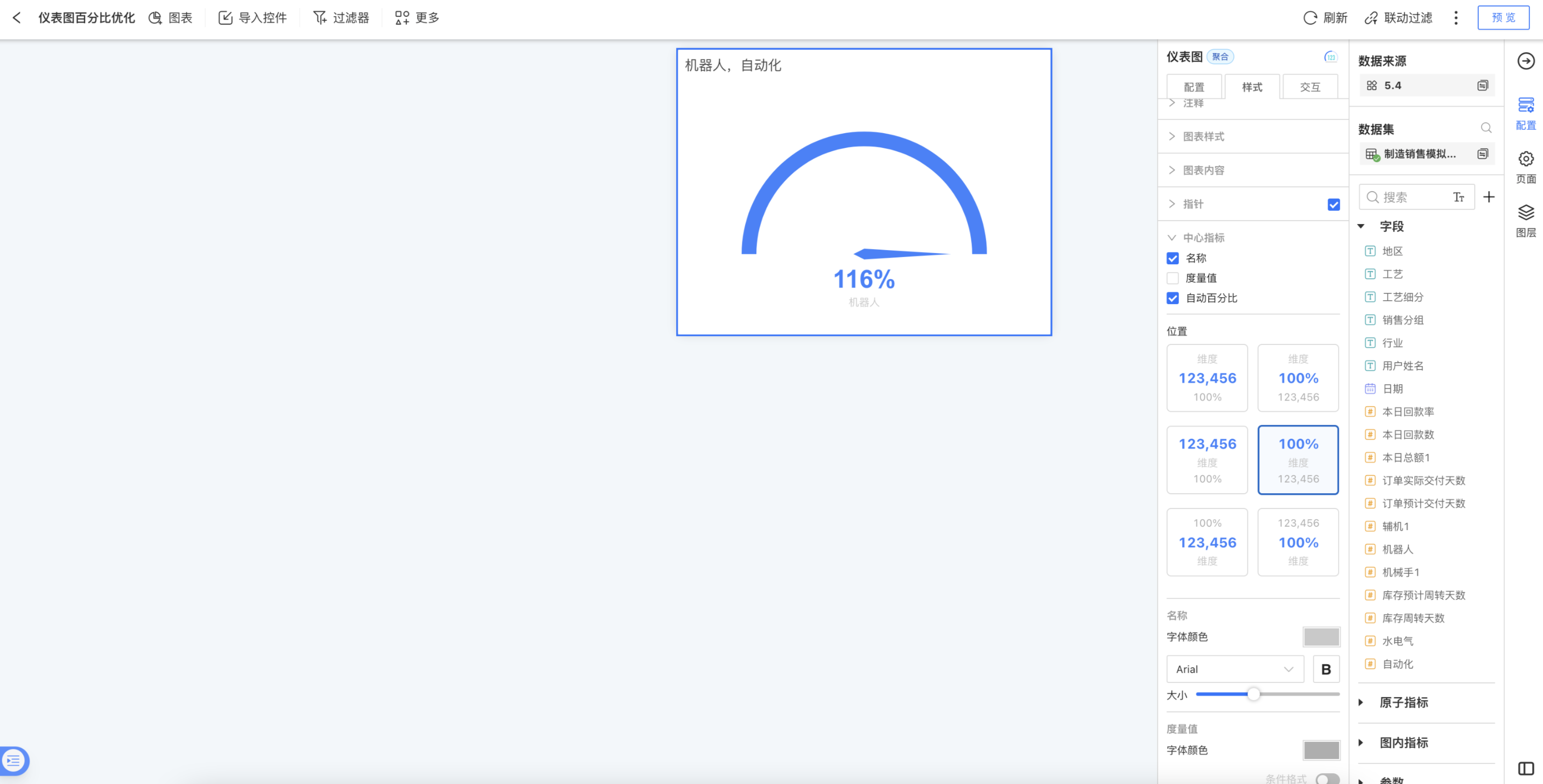 中心指标包括名称、度量、自动百分比。 可以设置它们的位置及颜色。