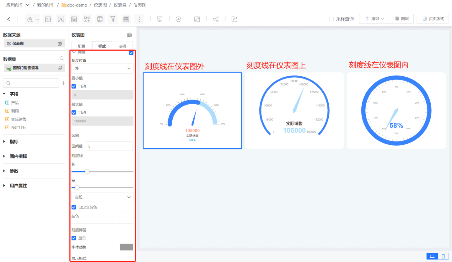刻度支持设置刻度位置,刻度最小值、最大值,刻度区间、区间的刻度线的长宽、线型和颜色,刻度标签展示,区间内刻度、区间内刻度线的长宽、线型和颜色。