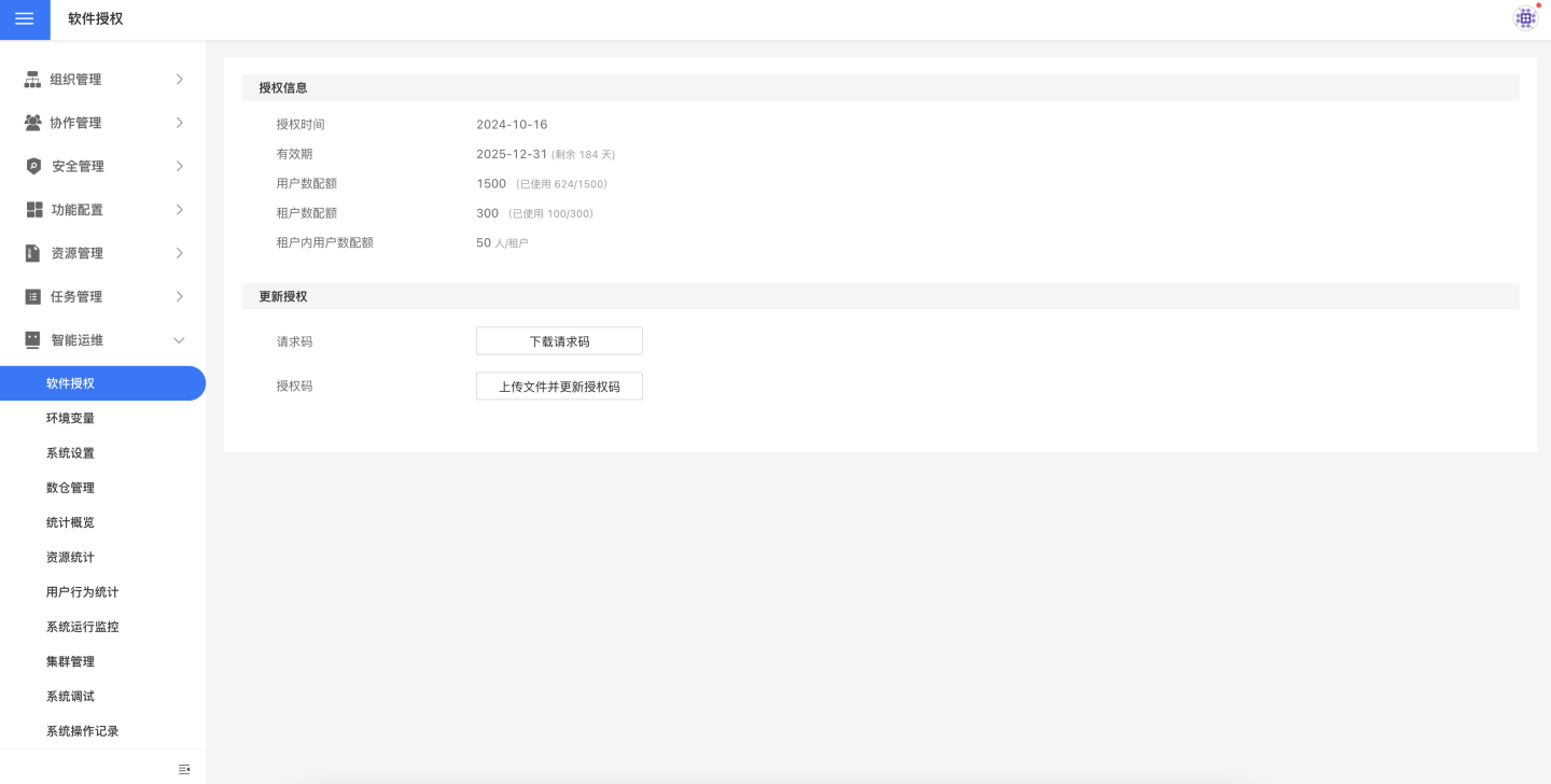 在设置->智能运维->软件授权页面可以看到授权时间、有效期、用户数配额、租户数配额、租户内用户数配额、请求码、授权码。