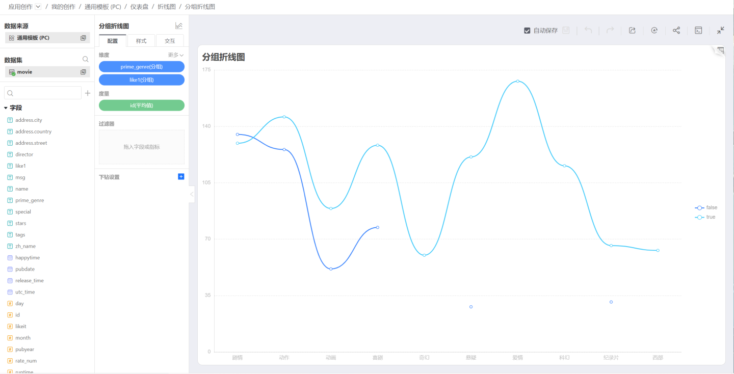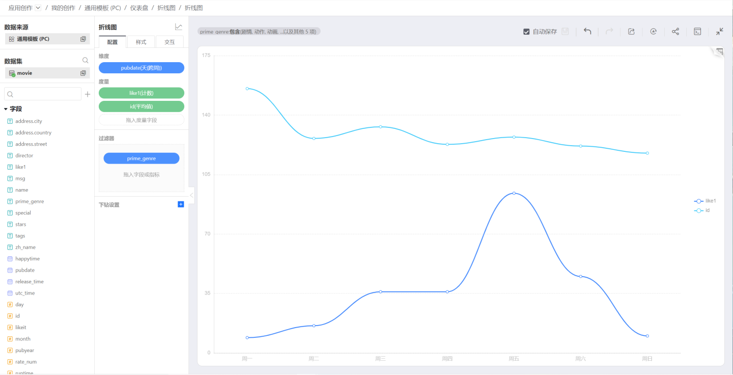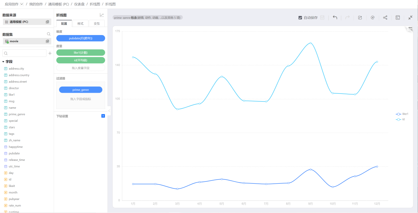 折线图、折线柱状图支持设置字段线条为虚线样式。配置路径:样式 > 其他 > 线段类型,支持统一设置,也支持按照单个字段进行设置。