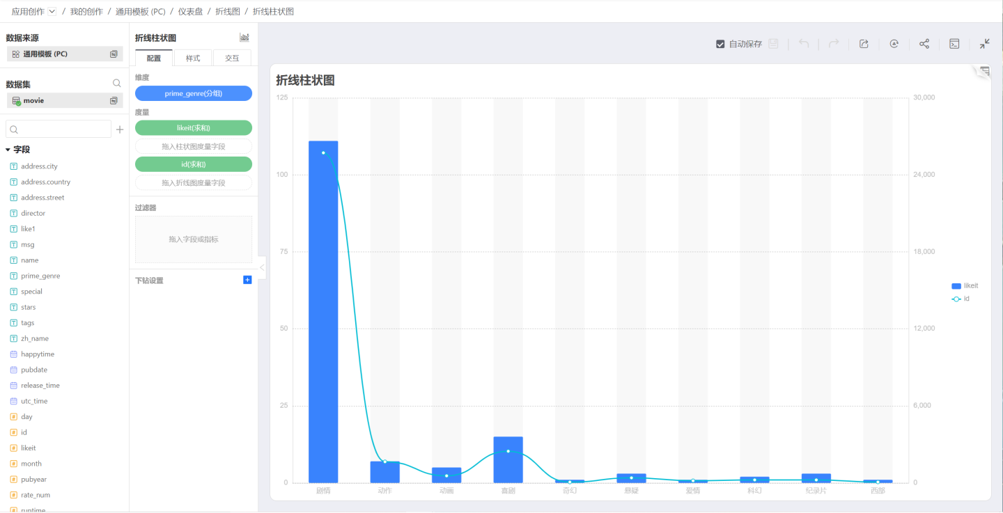 折线图通常展示基于时间维度上一个或多个度量的变化趋势,和柱状图可以搭配使用。