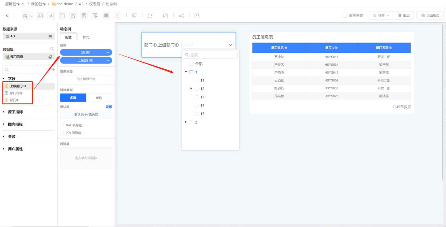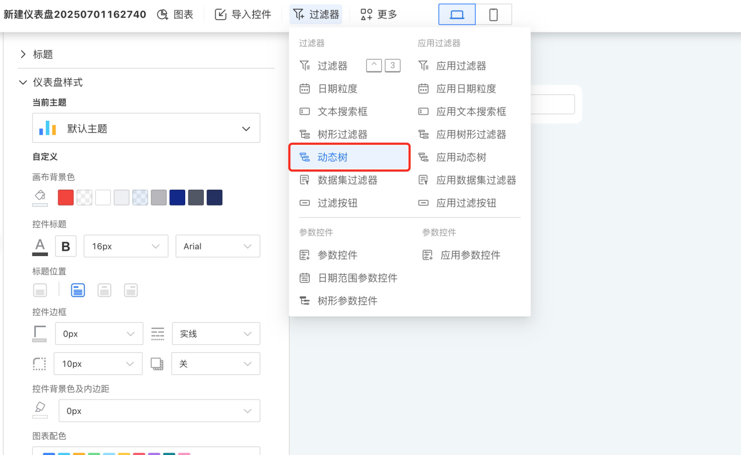 在仪表盘中添加动态树过滤器,设置动态树过滤器字段。