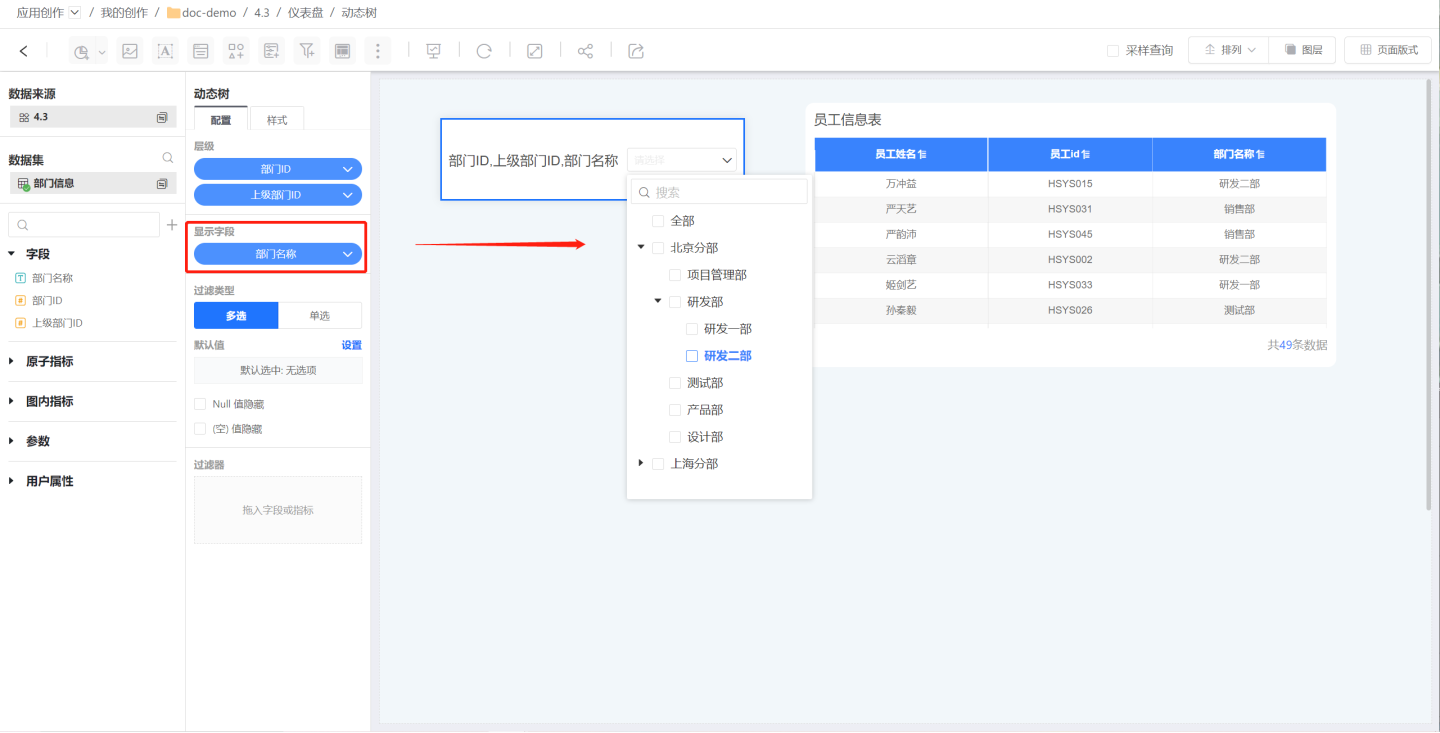 - 拖入显示字段,此时过滤器选项呈现显示字段的内容。 示例中使用部门 ID 建立层级关系,拖入部门名称用做选项展示。