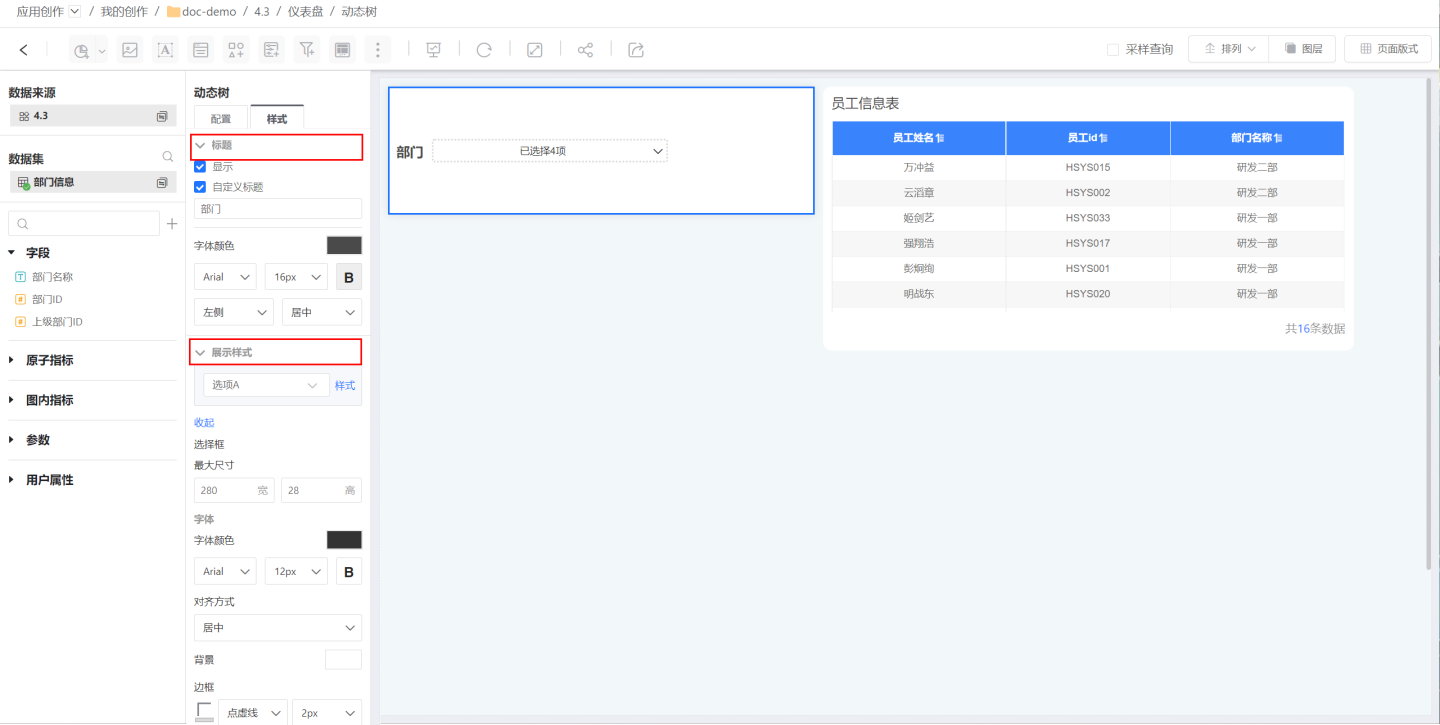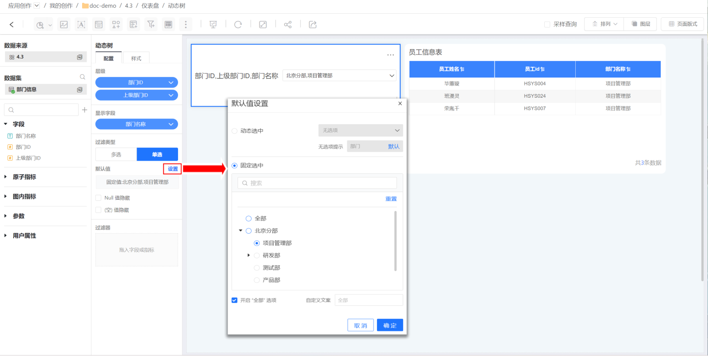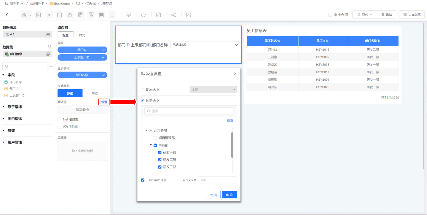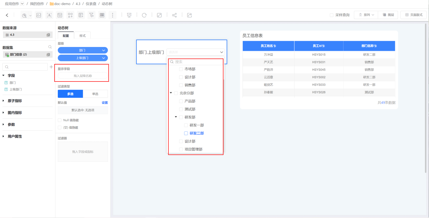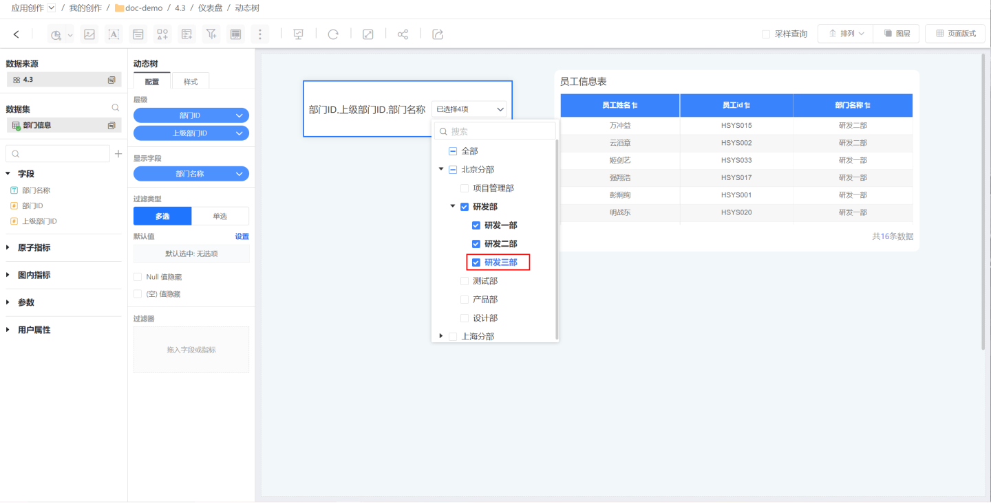 - 当数据集层级关系变化,如增加层级关系,减少层级关系时,动态树的层级结构会跟随数据集自动变化,不用编辑、修改。示例中新增研发三部,在数据集数据变化后,过滤器中自动展示该选项。