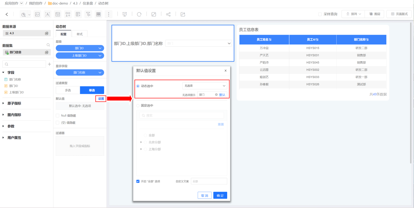 单选类型的动态树过滤器表示一次只能选中一个过滤选项进行数据筛选。默认值设置时支持动态选中和固定选中。