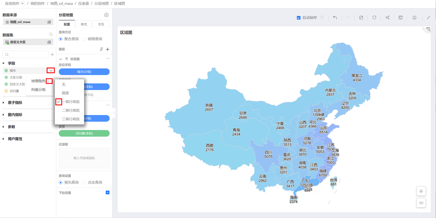 方法一:在地图编辑页面的数据区域,点击需要转化的地理信息的下拉箭头,在地理角色中选择与地理信息对应的行政区域。
