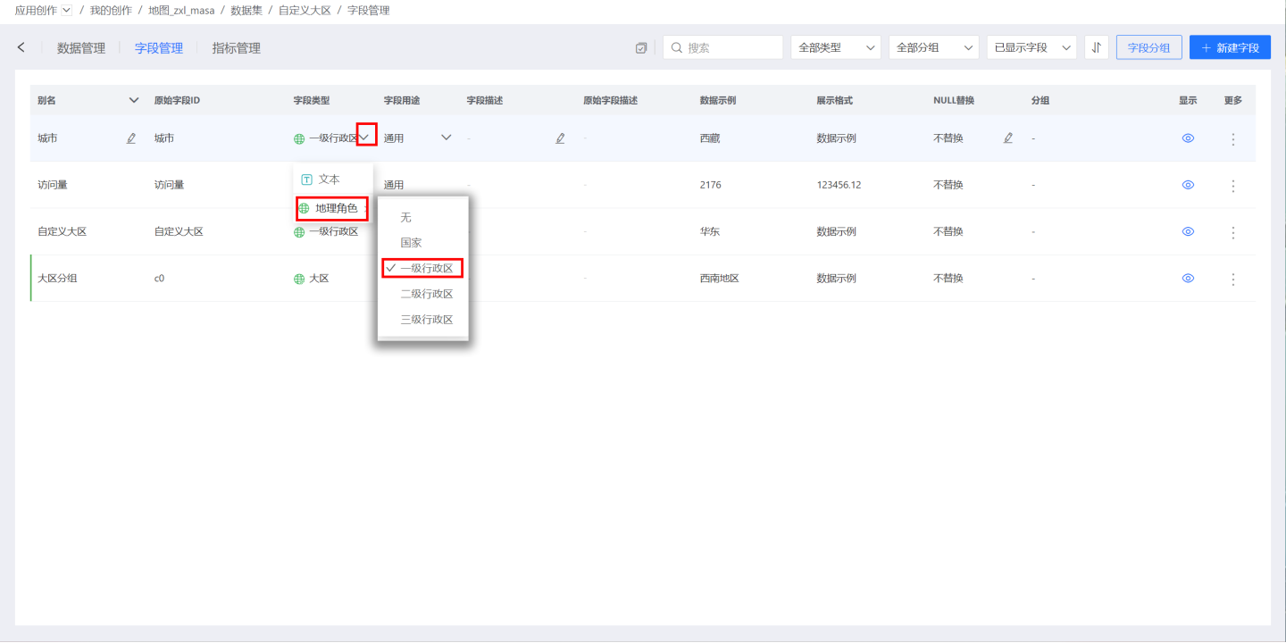 方法二:在数据集->字段管理中,根据需要转化的地理信息的别名,点击相应字段类型的下拉箭头,在地理角色中选择与地理信息对应的行政区域。