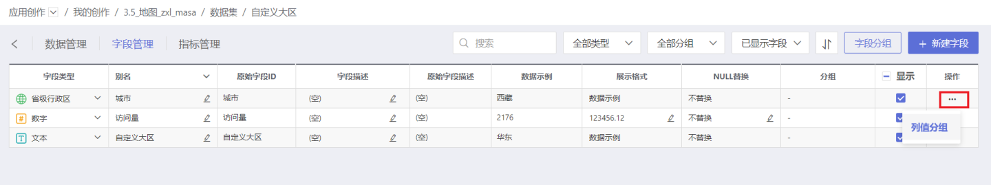 地理角色字段与其他类型数值的列值分组一样,在数据集的字段管理中,点击地理角色字段的三点菜单,进行列值分组。