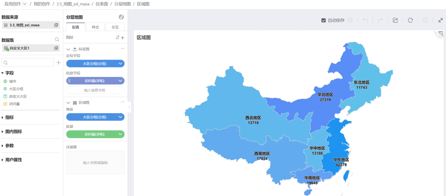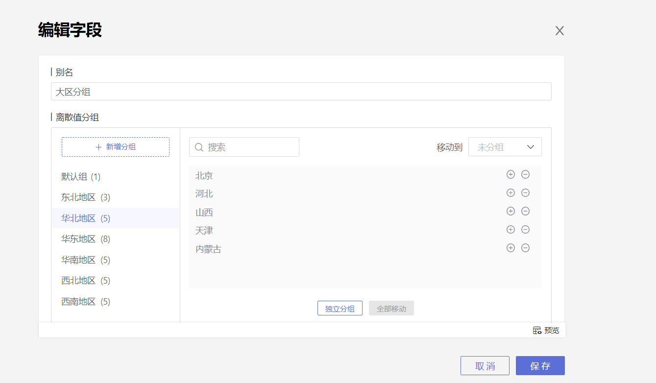 在使用地图分析数据时,常常涉及区域的概念。比如天气预报中常提及华北地区有大到暴雨,这里的华北地区不是某个具体省市,可能是几个省或者几个城市连起来的一个区域。针对这种情况可以使用地理角色列值分组功能,将地理角色中的字段根据实际区域组合成一个新的地理角色字段,使用新的地理角色字段制作地图,这种地图通常称为大区地图。