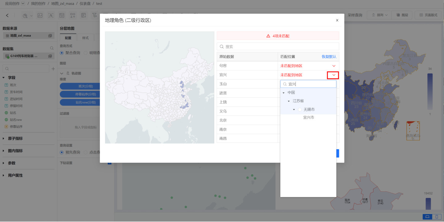 匹配规则要求仅在当前行政层级匹配,比如地理角色选择一级行政区,北京市海淀区这个字段只能匹配为北京市,不能匹配到三级行政区。 对已经匹配成功的地理字段也支持手动修改对应的行政区。 三级行政区名称不唯一,如南京市有鼓楼区,徐州市也有鼓楼区,三级行政区进行地理角色匹配时,会将三级行政区与省、市进行关联,使三级行政区名称唯一。 这种场景要求省、市级字段必须进行地理角色转换。