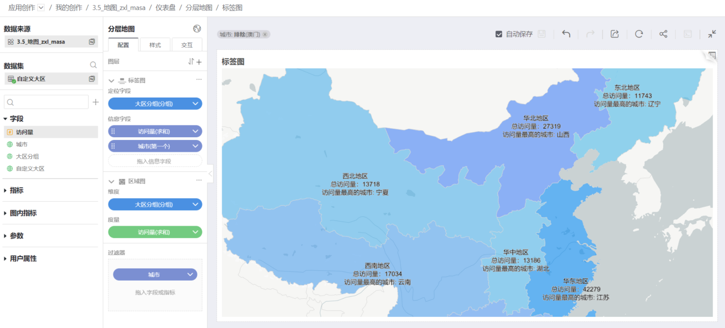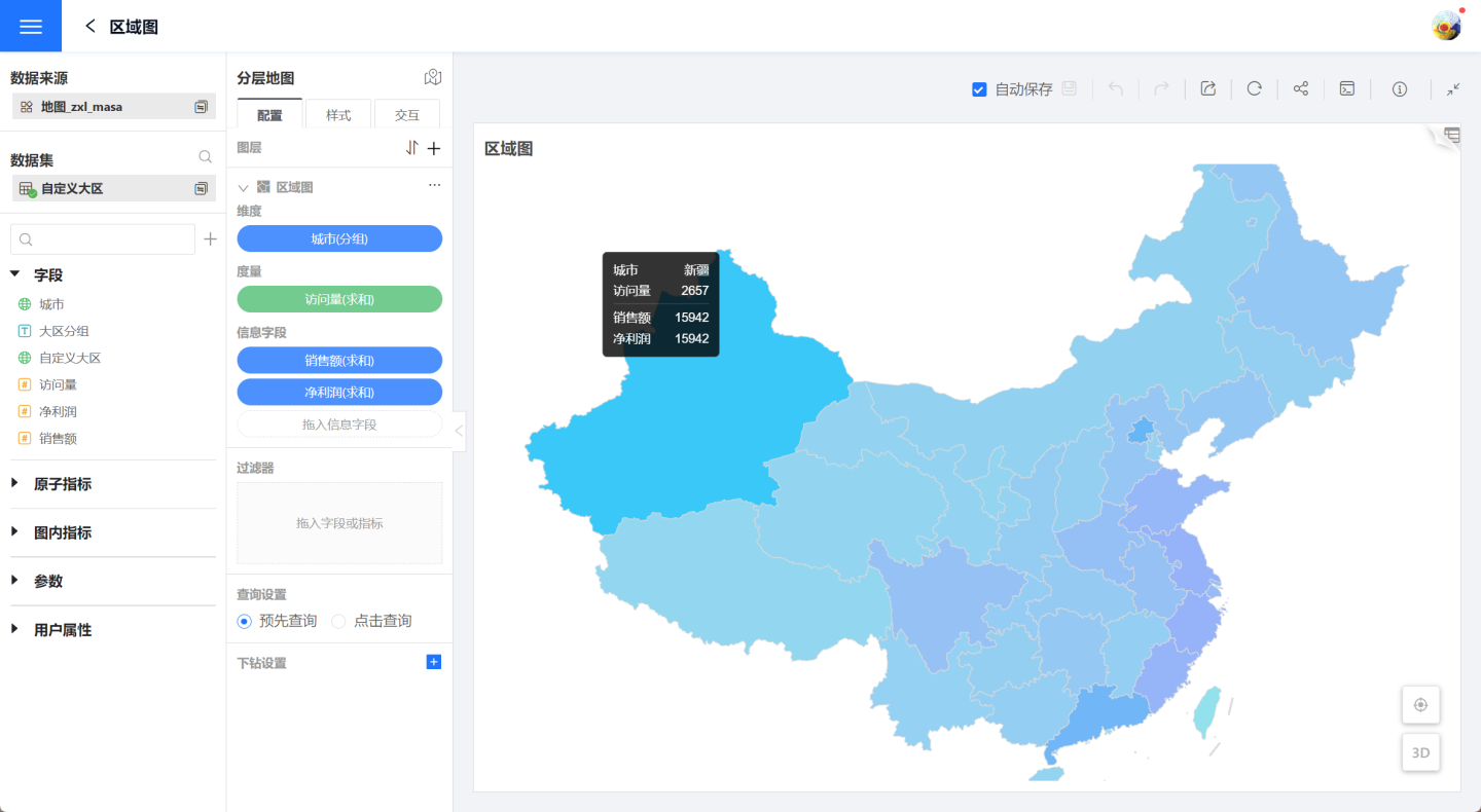 区域图是在地图中填充所在的地理区域并显示区域的数据信息。如用户想查看不同区域的销售量时,可以使用区域图展示。