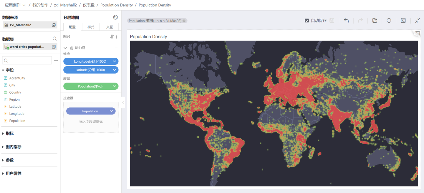 在地图中显示可视数据集中的趋势时,可以使用热力图来展示。 如人口密度、假期旅游热门景点、员工集中出差城市等。