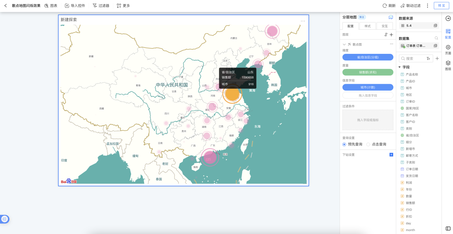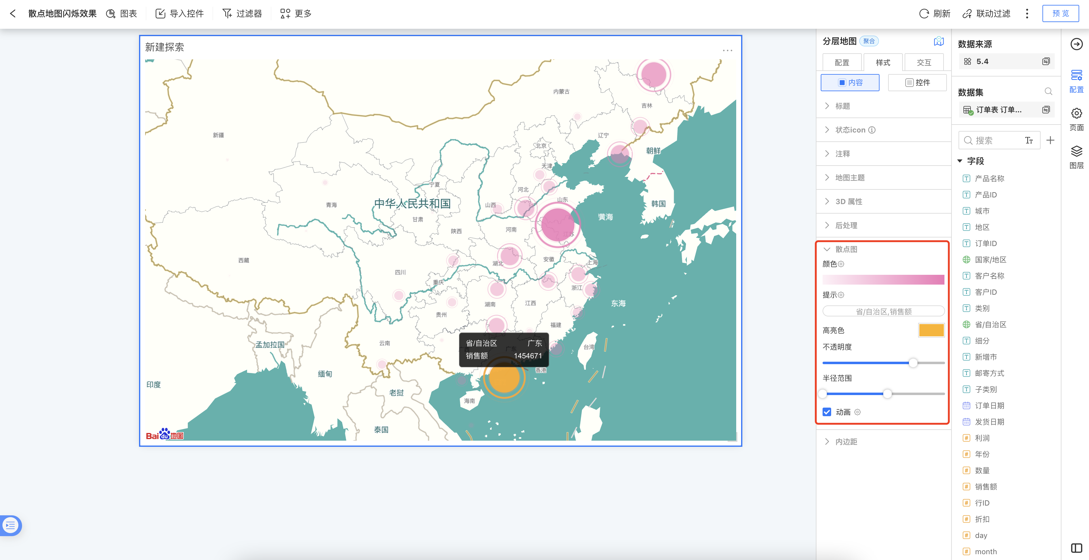 - 基本配置要求 散点图需要配置一个维度字段,一个度量字段,若干信息字段。
