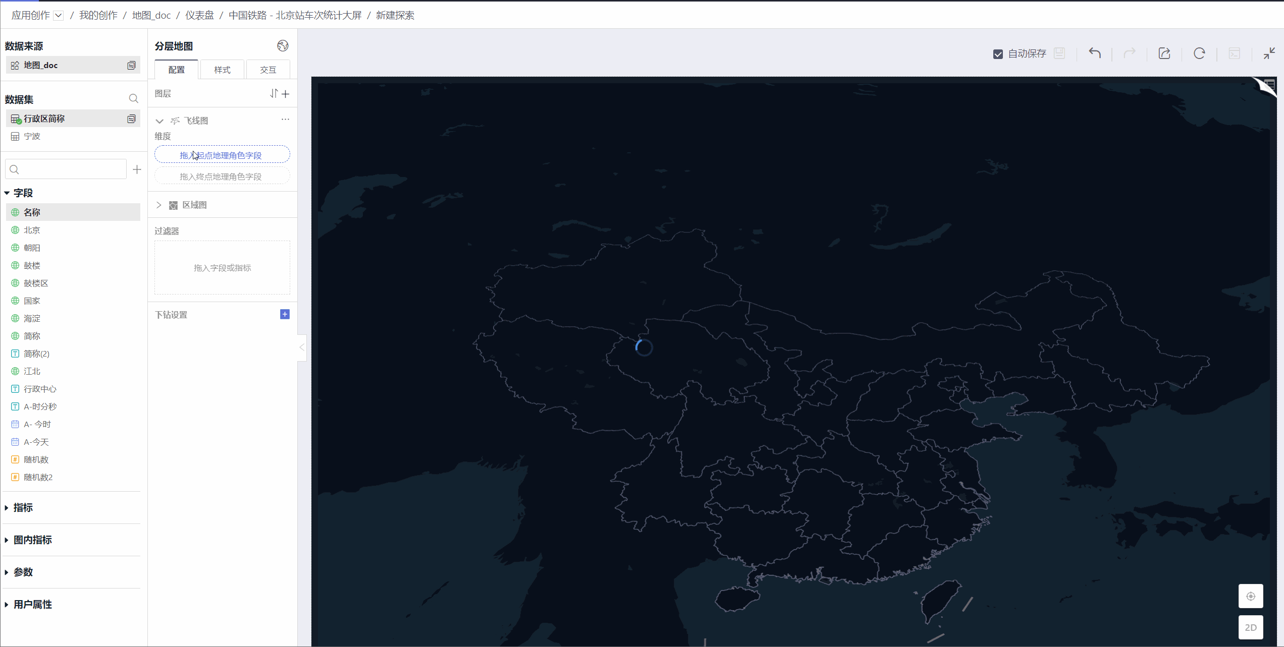 - 基本配置要求 飞线图需要配置两个维度信息。一个是起点的地理信息,一个是终点的地理信息。维度信息支持地理模式和经纬度模式两种定位模式。使用地理模式时需要将字段进行地理角色转换。
