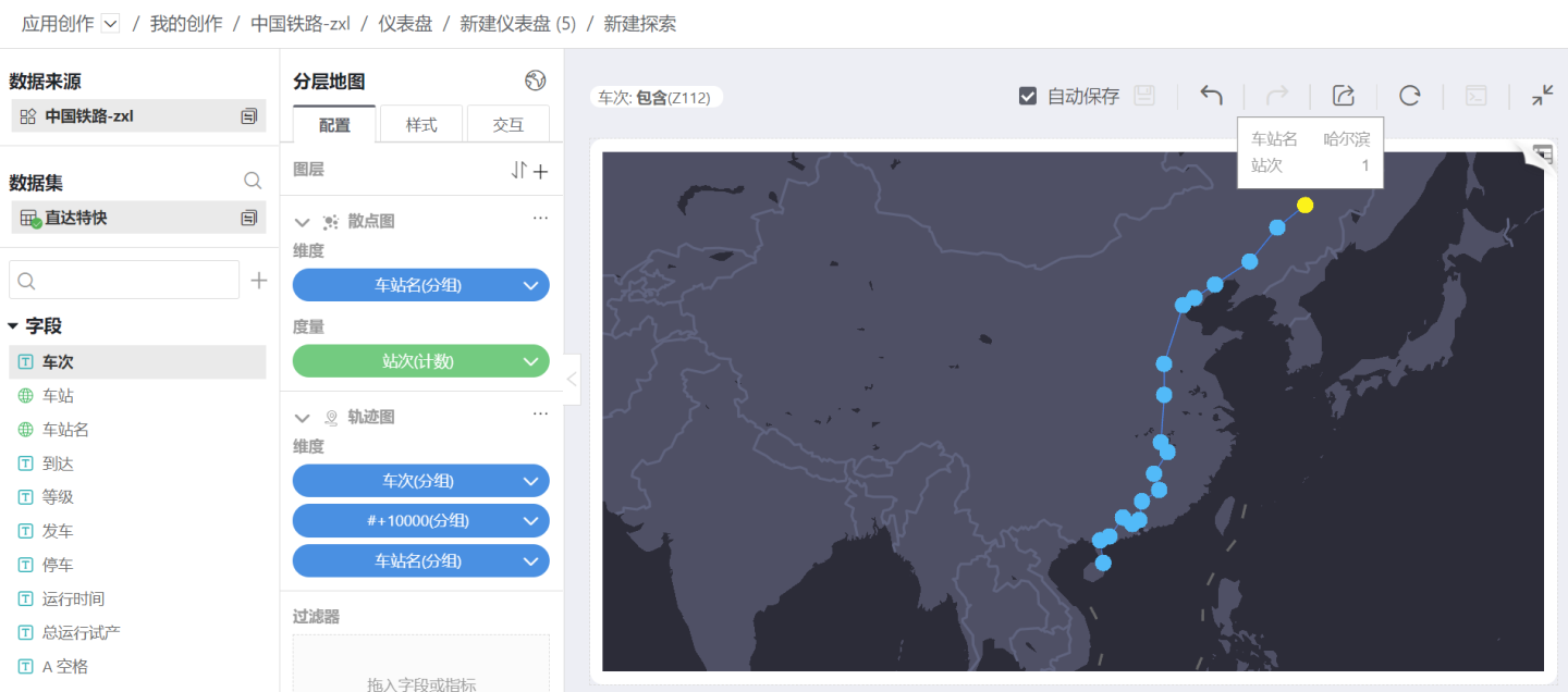 - 基本配置要求 轨迹图需要配置三个维度信息,分别为轨迹标识字段、轨迹顺序字段、地理角色字段。