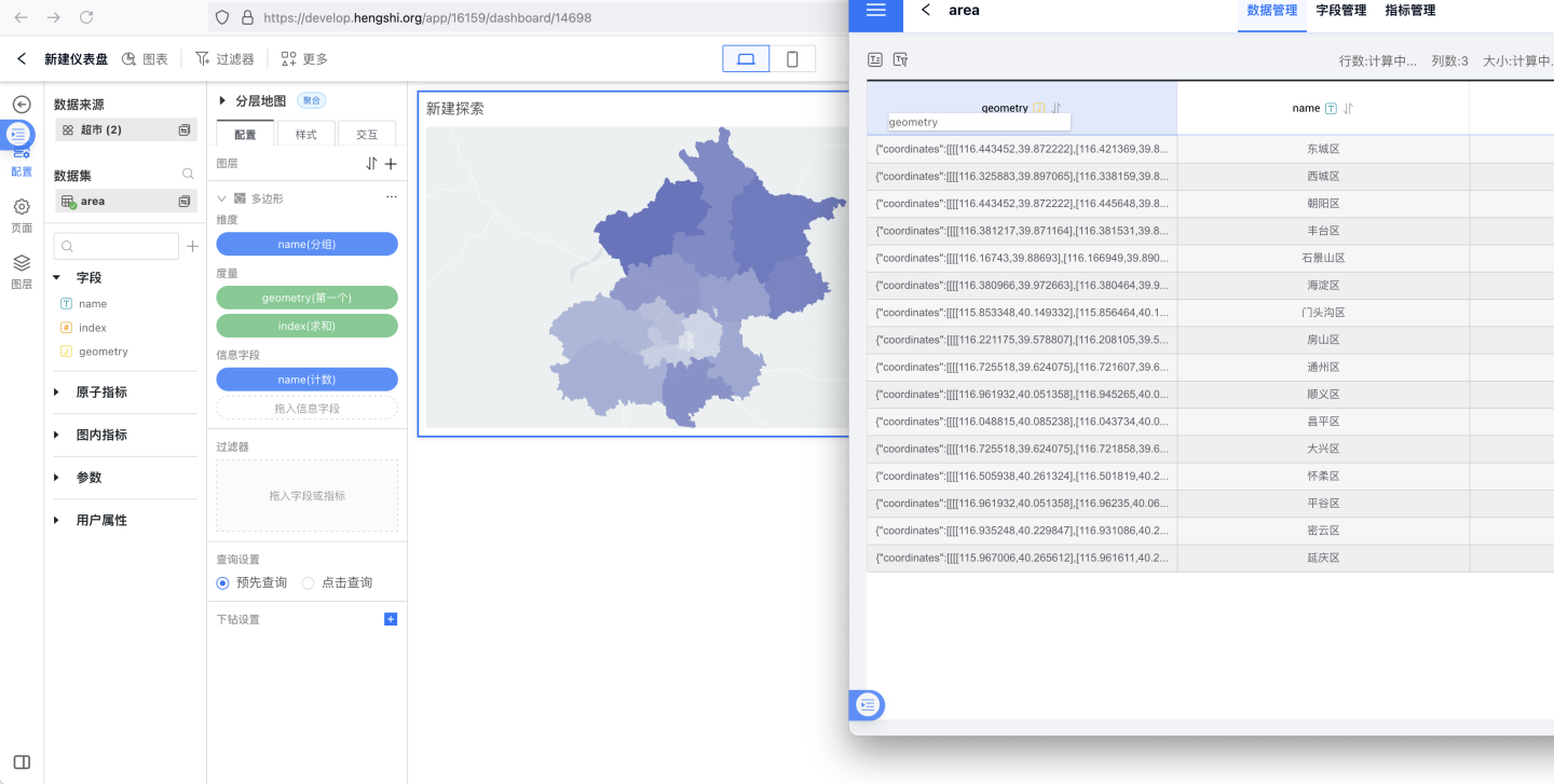 GeoJSON 是一个常用的地理位置信息存储标准,它可以用一致的数据结构存储地理位置中关于点、线、多边形、组合多边形等等概念。在衡石5.2功能更新中,我们提供了对 PostGIS 中地理位置信息的读取和加载,转化成标准的 GeoJSON 格式,并且在地图中新增了多边形的图层。通过这个新图层,用户可以灵活定义自己的地理围栏,而不需要局限于标准地图。