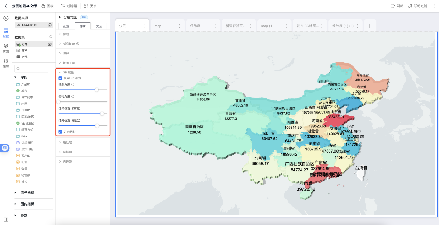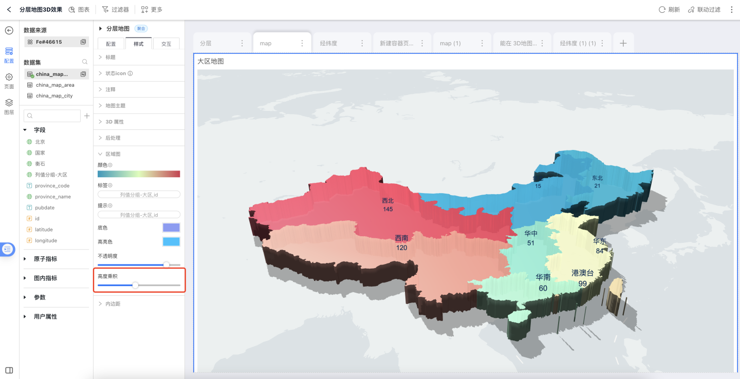 在区域图图层上添加3D 地图高度设置,配置路径:分层地图>样式>区域图>高度乘积。