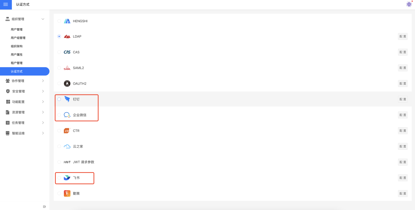 企业微信、飞书、钉钉支持同步组织架构。以钉钉为例:打开设置->组织管理->认证方式,选择 钉钉,点击配置。