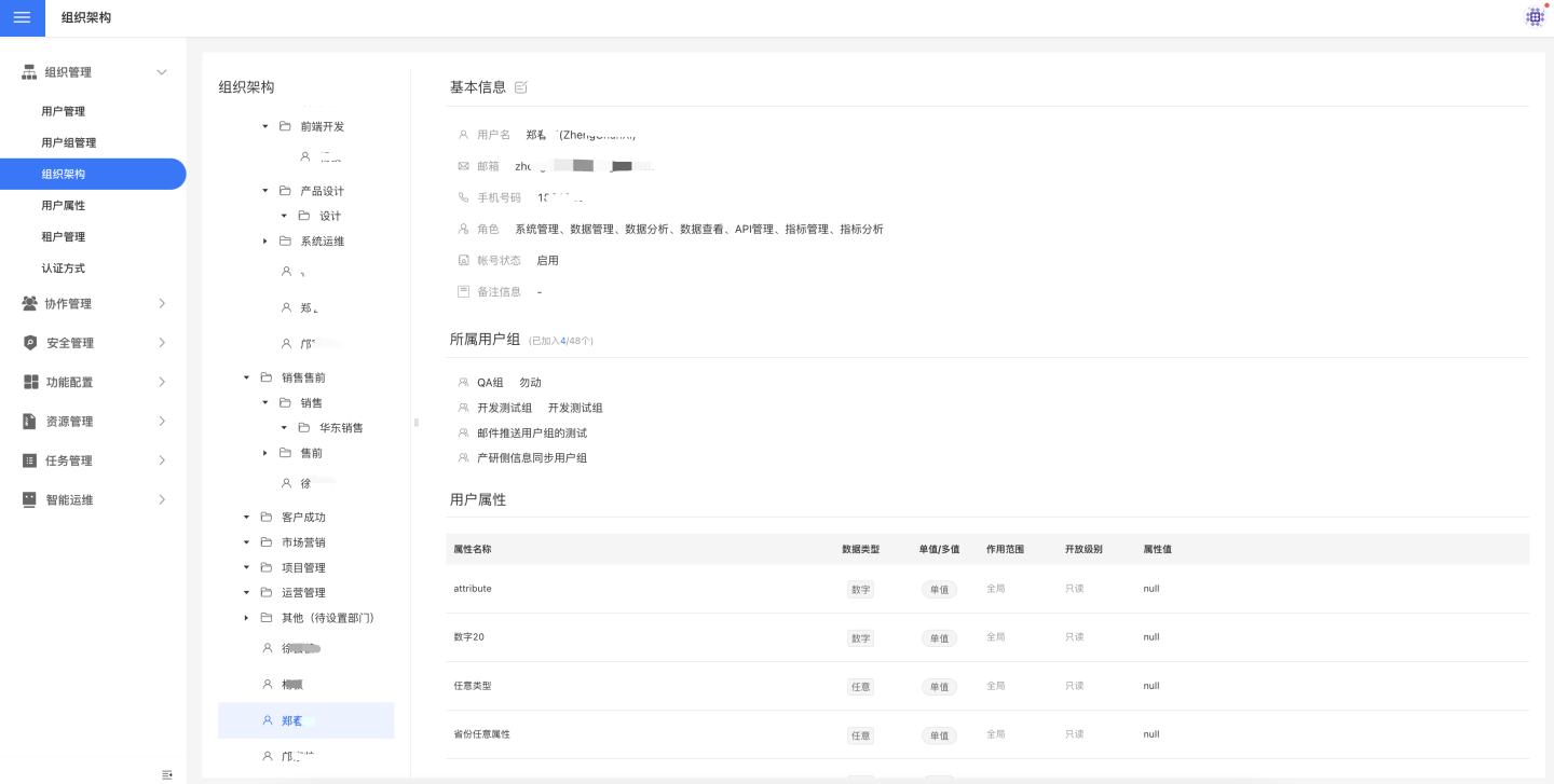 启用组织架构后,在组织架构页面可以看到相关信息,可以查看和编辑每个用户的信息。