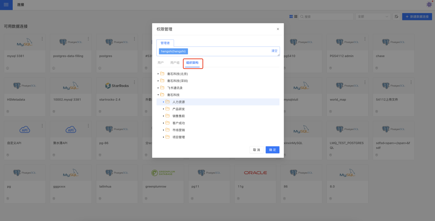 在系统中进行权限授予时,可给某组织部门节点进行授权,以达到给部门用户批量授权的效果。例如在连接权限中选择授权对象时,可以直接选择组织架构节点,实现对部门内全部用户授权。