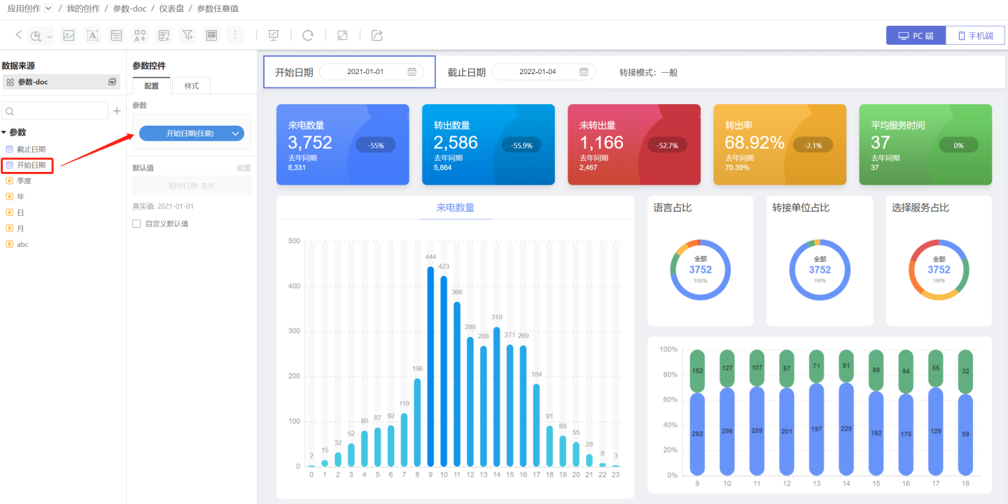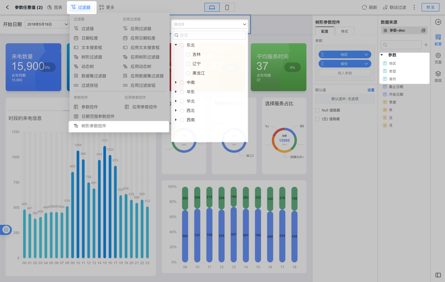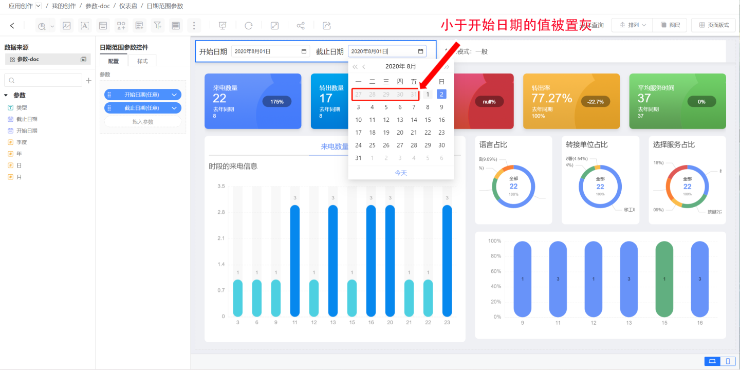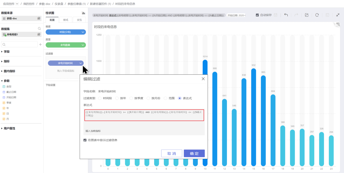 如果创建图表的数据集没有使用参数,那么可以在创建图表过程中通过图内过滤器将该图表与参数关联起来。 如图所示,在来电开始时间的过滤器中,使用参数表达式进行过滤,这样将参数图表关联起来。 参数控件变化时,过滤器的值发生变化,从而影响图表的显示。